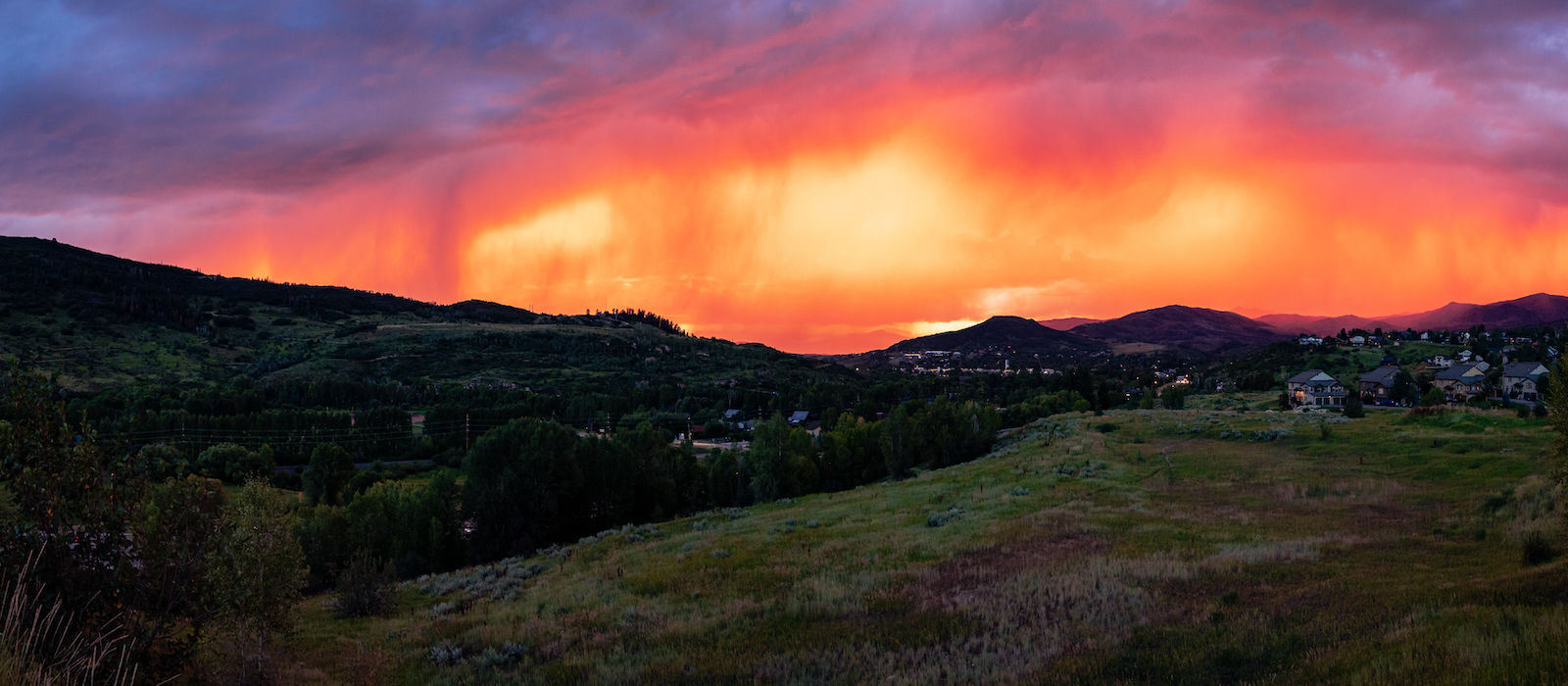A rainstorm covers Steamboat Springs as the sun peaks through the rain. This is a panoramic of 3 photos stitched together.
