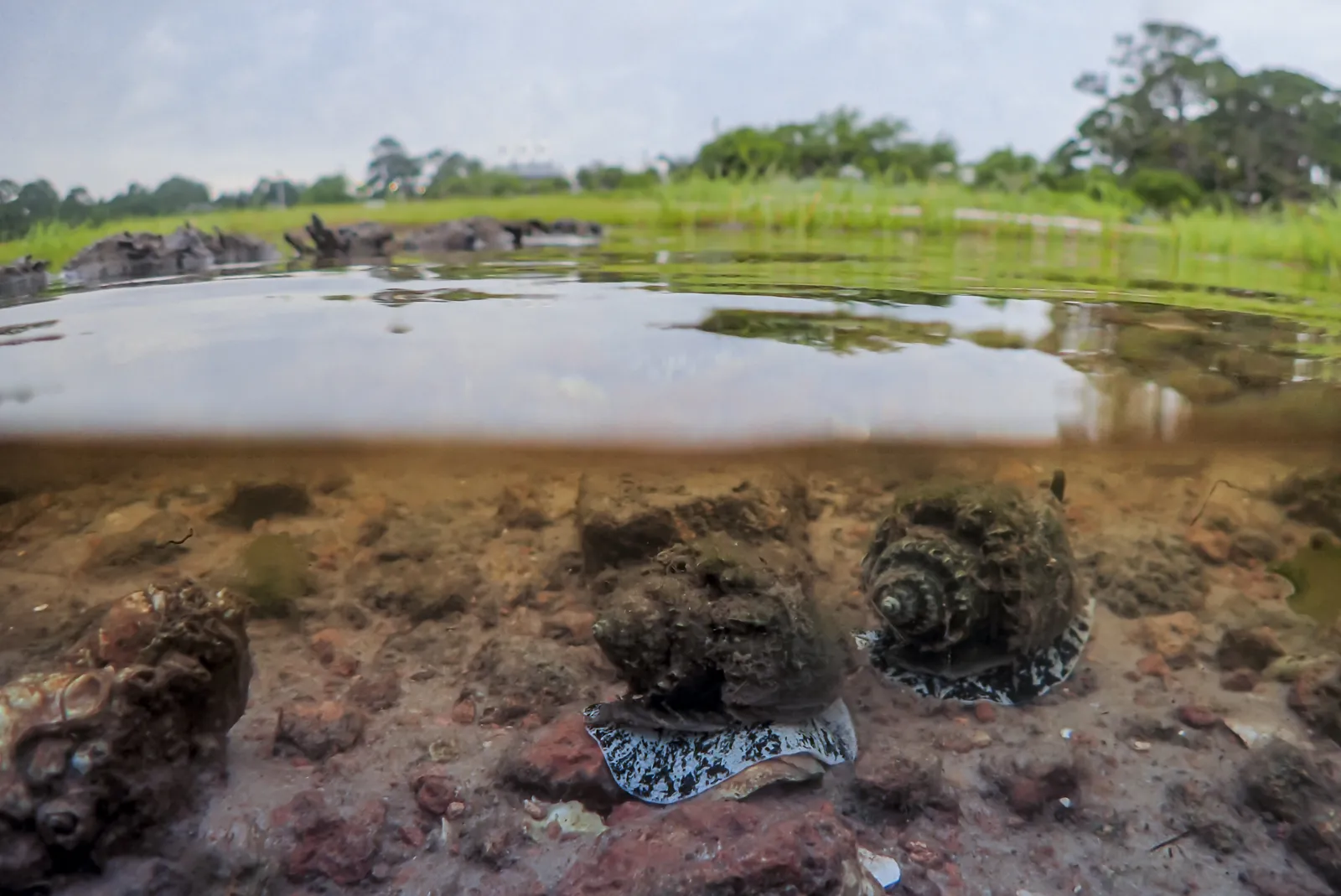 Two Florida Crown Conchs travers the coastal shore of the Gulf of Mexico. These scavengers keep the ocean floor clean, eating dead marine life that has washed ashore.
