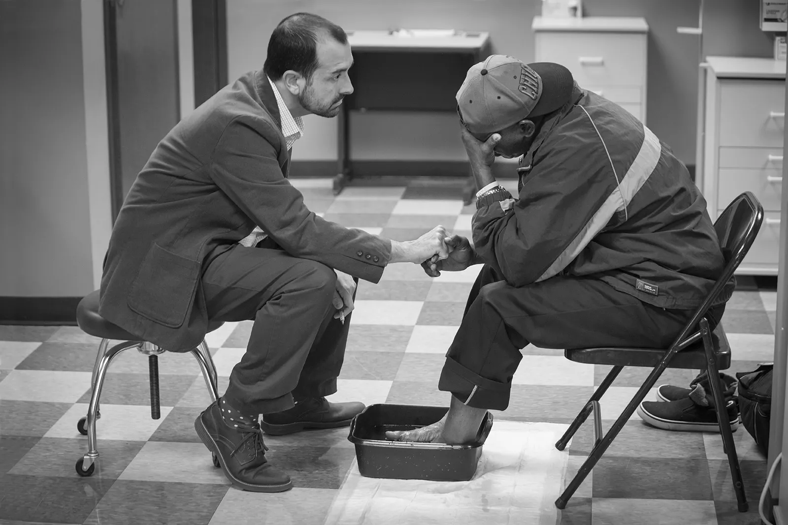 I was on location with our writer shooting for nursing program giving health and basic needs to the homeless. I was shooting foot care of an individual when I looked to my left and saw James holding the hand of a homeless man who just lost his wife a week earlier and trying to cope with life. I shot only one shot to avoid disrupting the moment. Now every time I look at this photo my heart fills with compassion. The photo cannot be used for nursing, nor any other purpose for our university but it is probably the most powerful shot I ever shot.