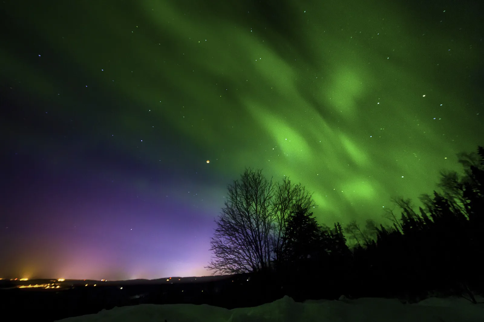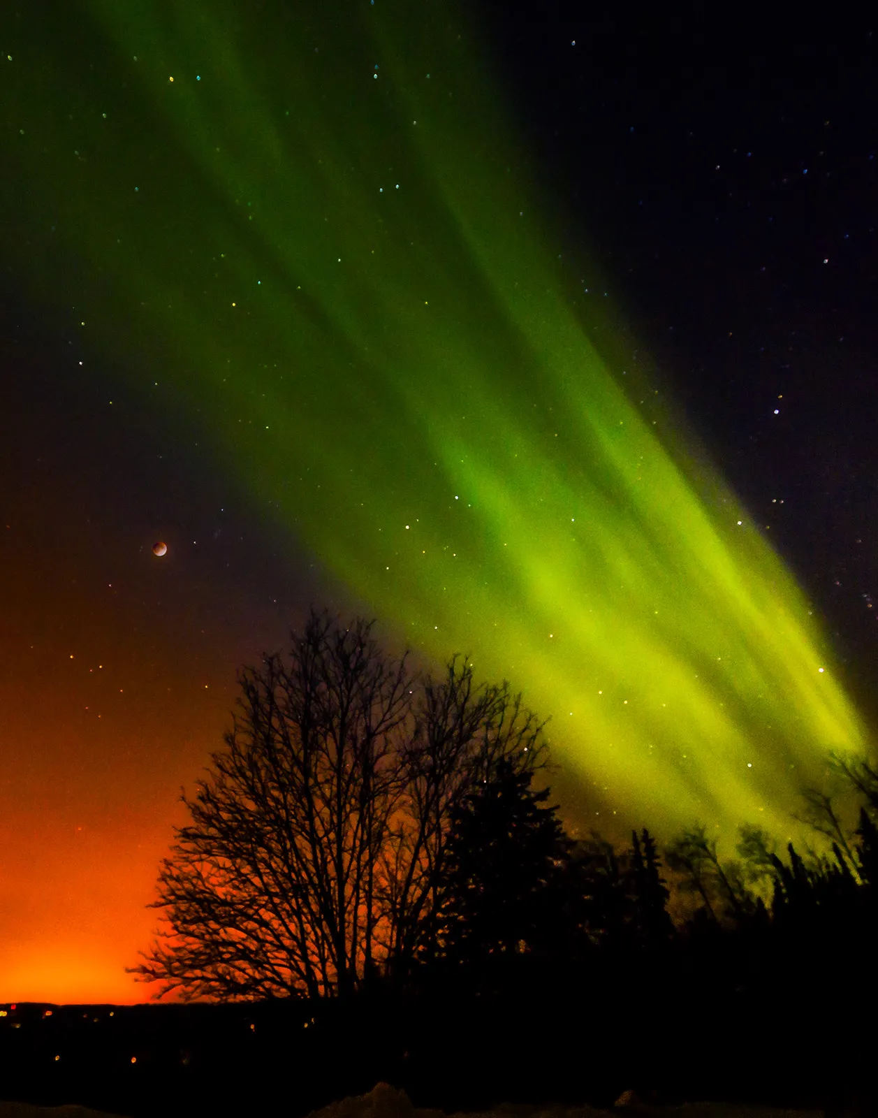 Photo of eclipsed moon with active aurora over the city lights of Fairbanks, taken the night of Jan. 31, 2018 at 4:00 a.m. Temperature at the time was -6°.