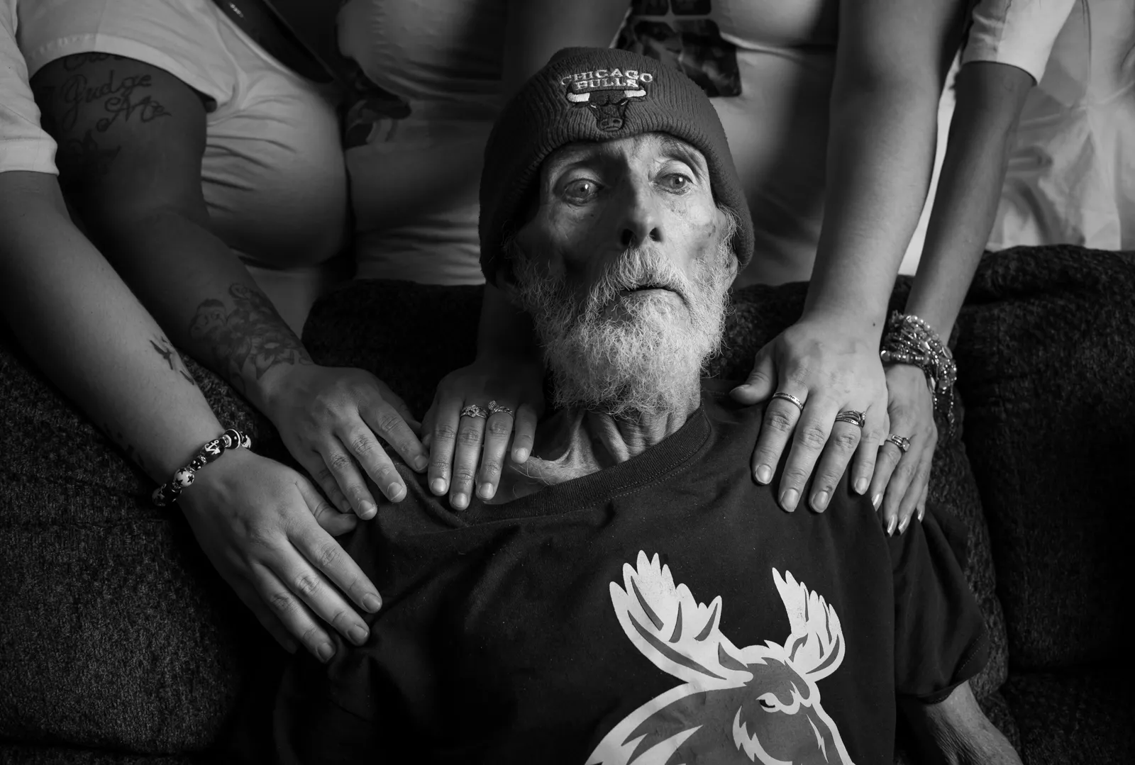 Hospice patient Jacinto Torres has his portrait taken with his daughters, Dec. 23, 2017.