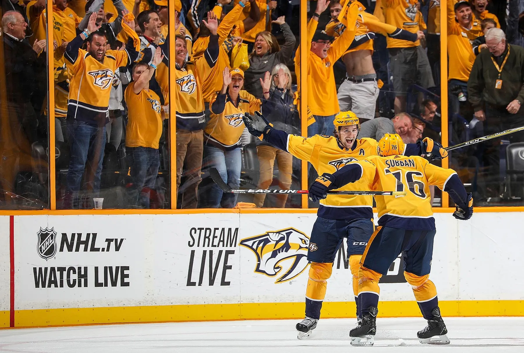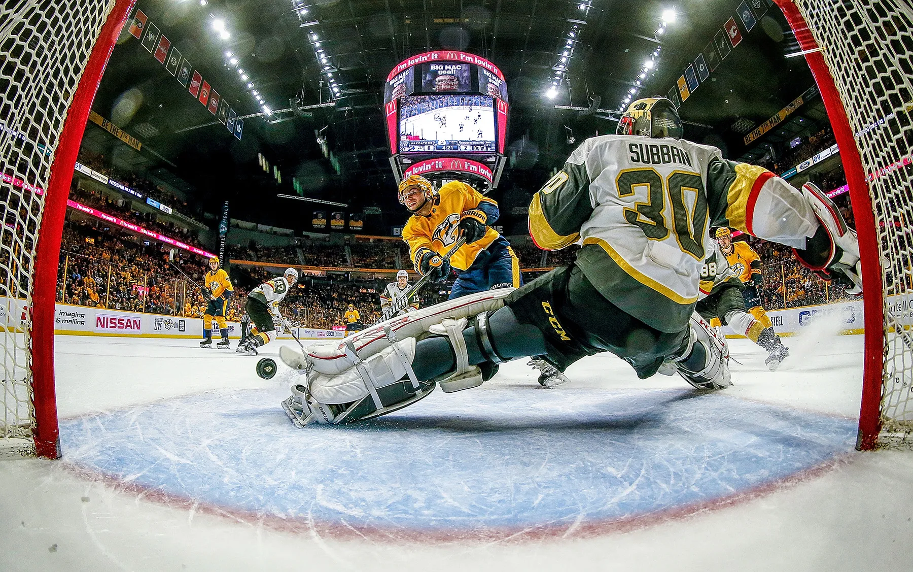 Calle Jarnkrok #19 of the Nashville Predators scores a goal against Malcolm Subban #30 of the Vegas Golden Knights in the second period during an NHL game at Bridgestone Arena on December 8, 2017 in Nashville, Tennessee.