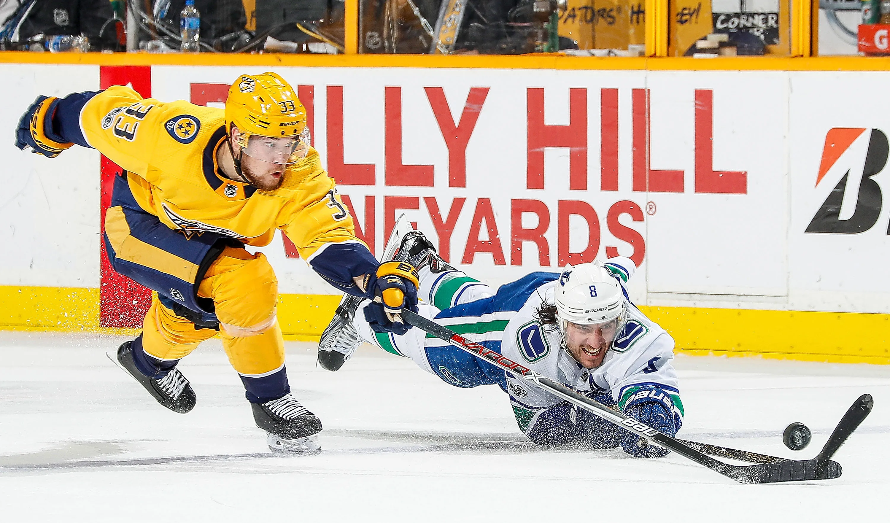 Viktor Arvidsson #33 of the Nashville Predators battles for the puck against Christopher Tanev #8 of the Vancouver Canucks during an NHL game at Bridgestone Arena.