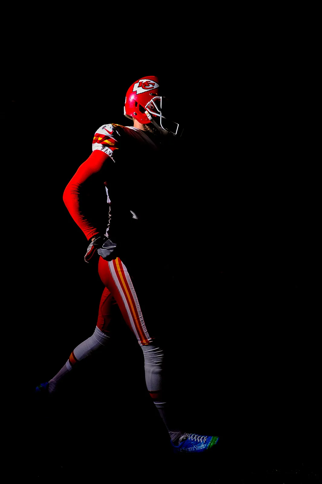 Kansas City Chiefs Dustin Colquitt runs towards the visiting team tunnel before an NFL football game between the Kansas City Chiefs and the New York Jets on Dec. 3, 2017, in East Rutherford, N.J. Photo was taken with an off-camera flash.