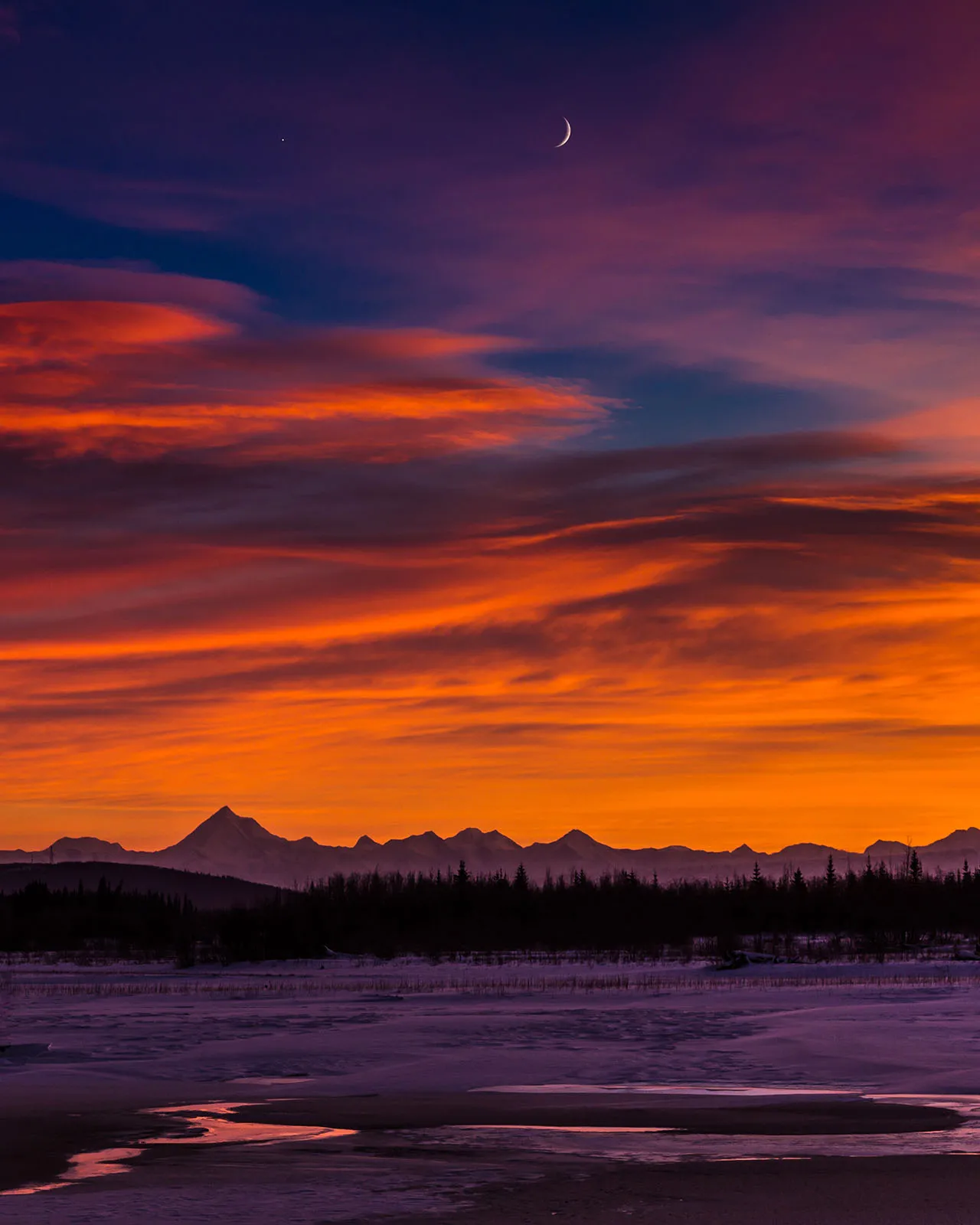 A crescent moon graces a colorful sky above the Alaska Range and the Tanana River about 40 miles southeast of Fairbanks. Photo taken about 4:30 p.m. January 1, 2017.