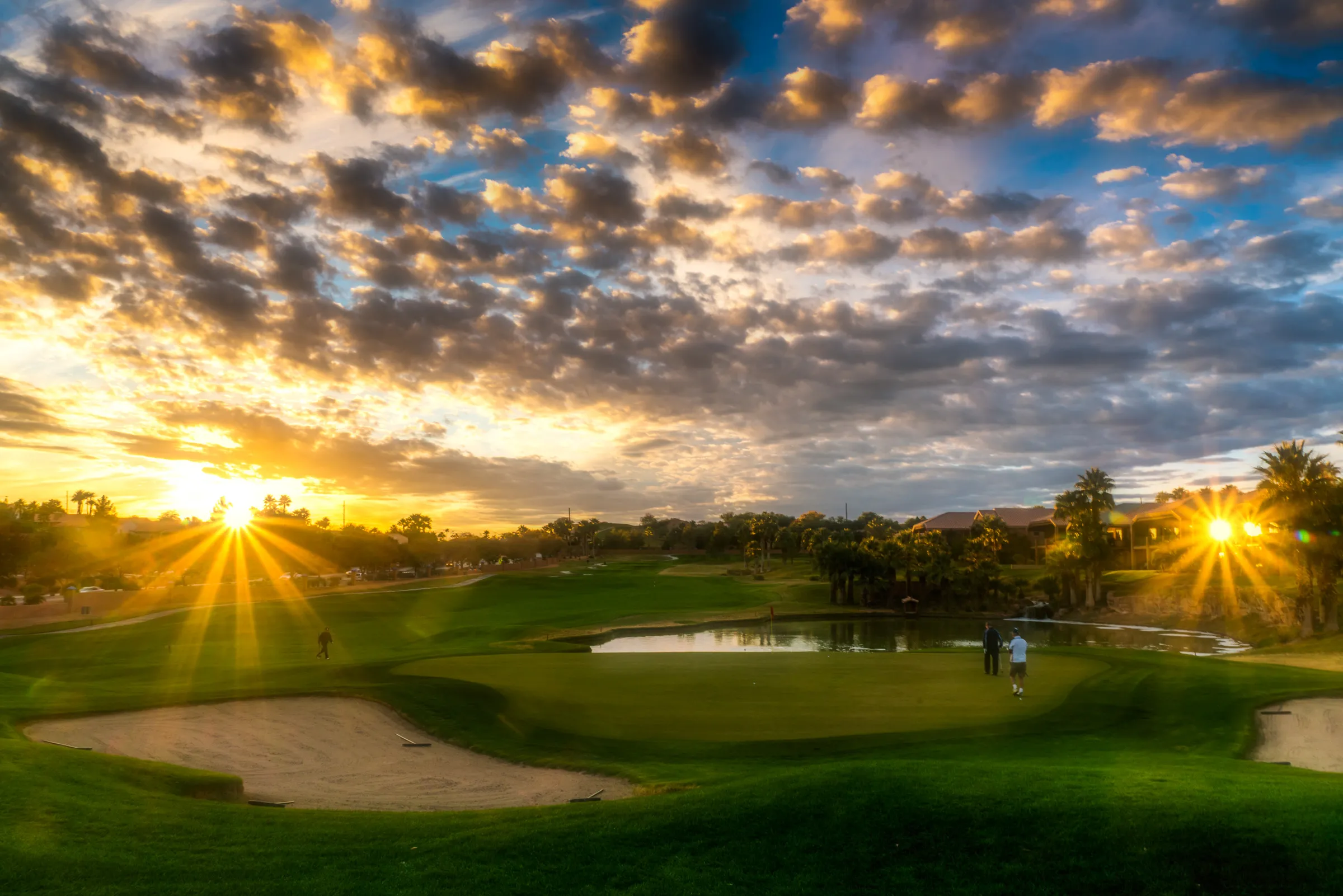 Twin starbursts appear over the 18th green while finishing up an afternoon round in Mesquite, Nevada.
