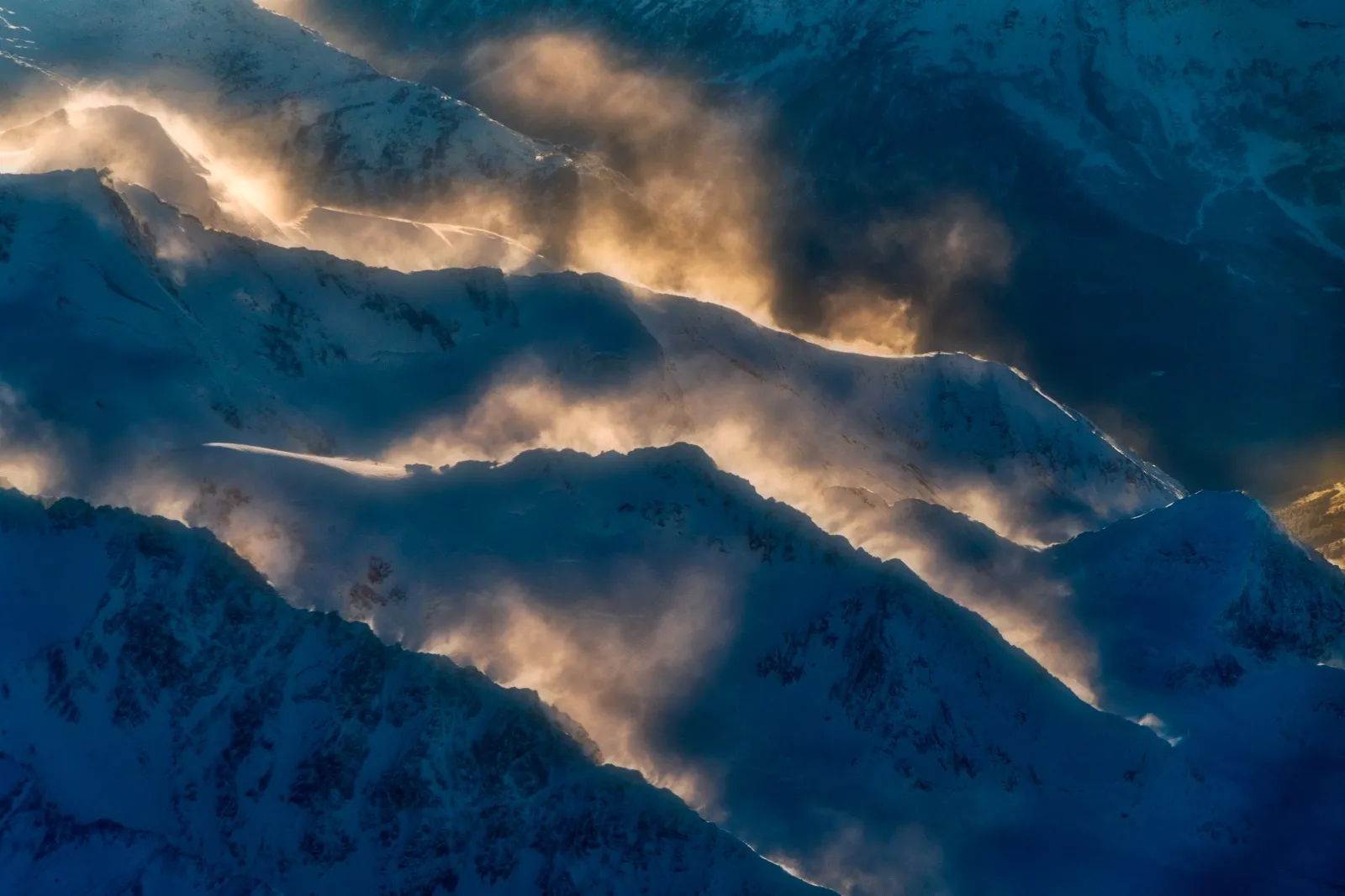 Fresh snow blown by high winds catch the morning sun during a flight over the Chugach Mountains near Anchorage.