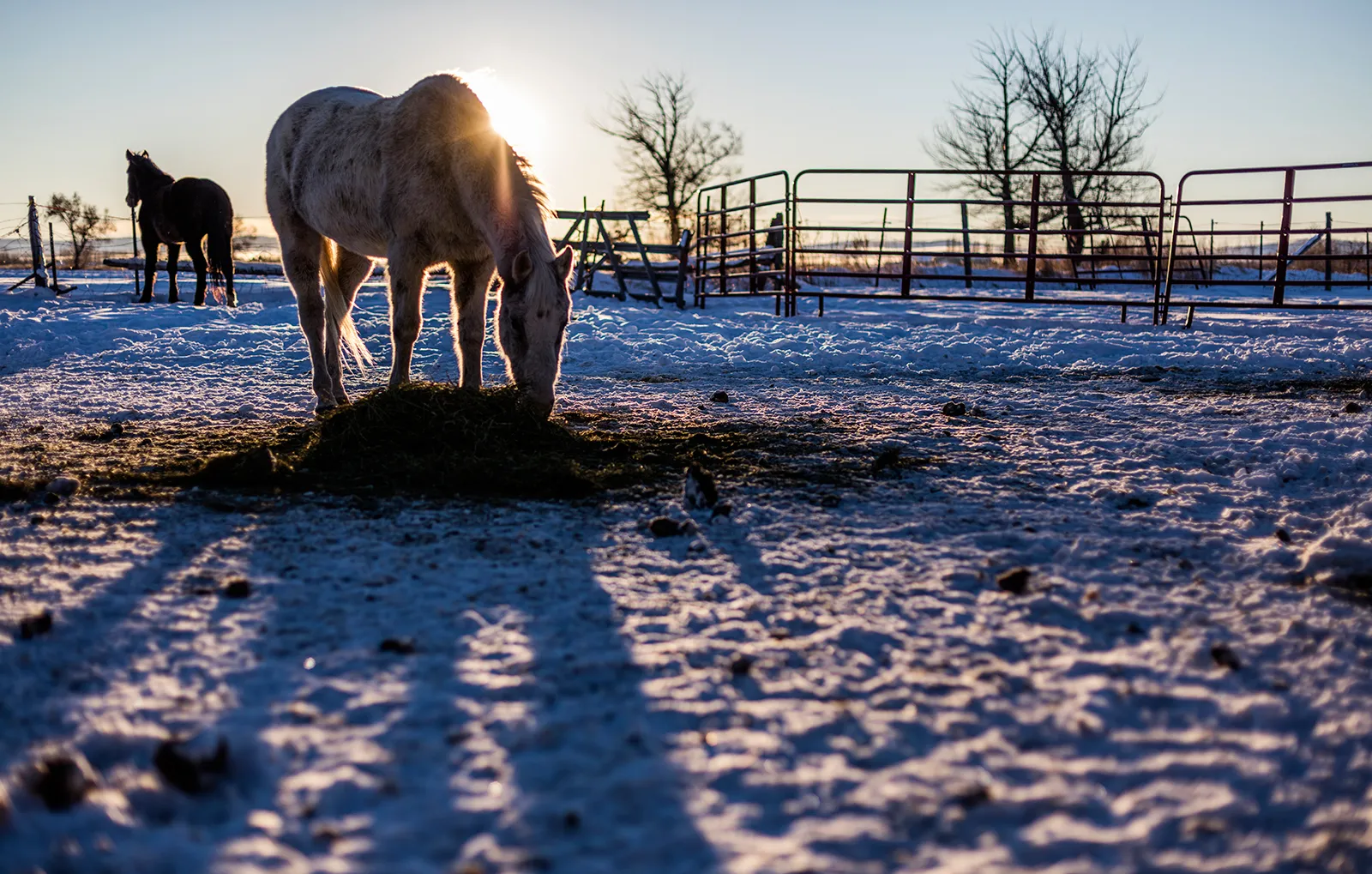 Mustangs adopted from the BLM program eat hay in their new home. The horses will not have to struggle for food on the open range during the harsh winter months.
