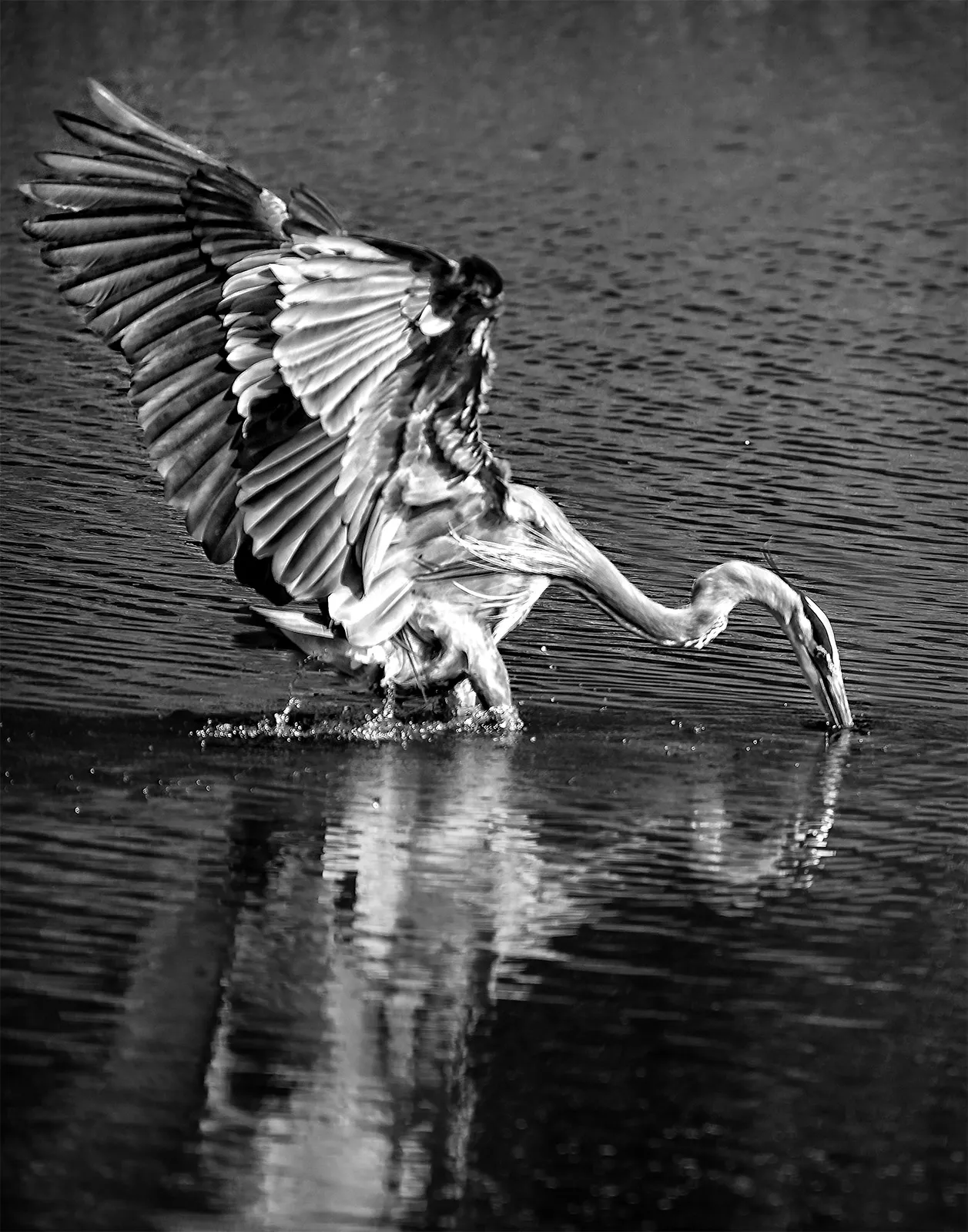 This Blue Heron flew a short distance and landed in the water to catch a fish. I converted the image to black and white to see more detail in his beautiful wing patterns. It is always exciting to stay in a wild environment long enough and quiet enough to have the animals continue with/resume their normal behaviors because, for a short time, they do not fear your presence.