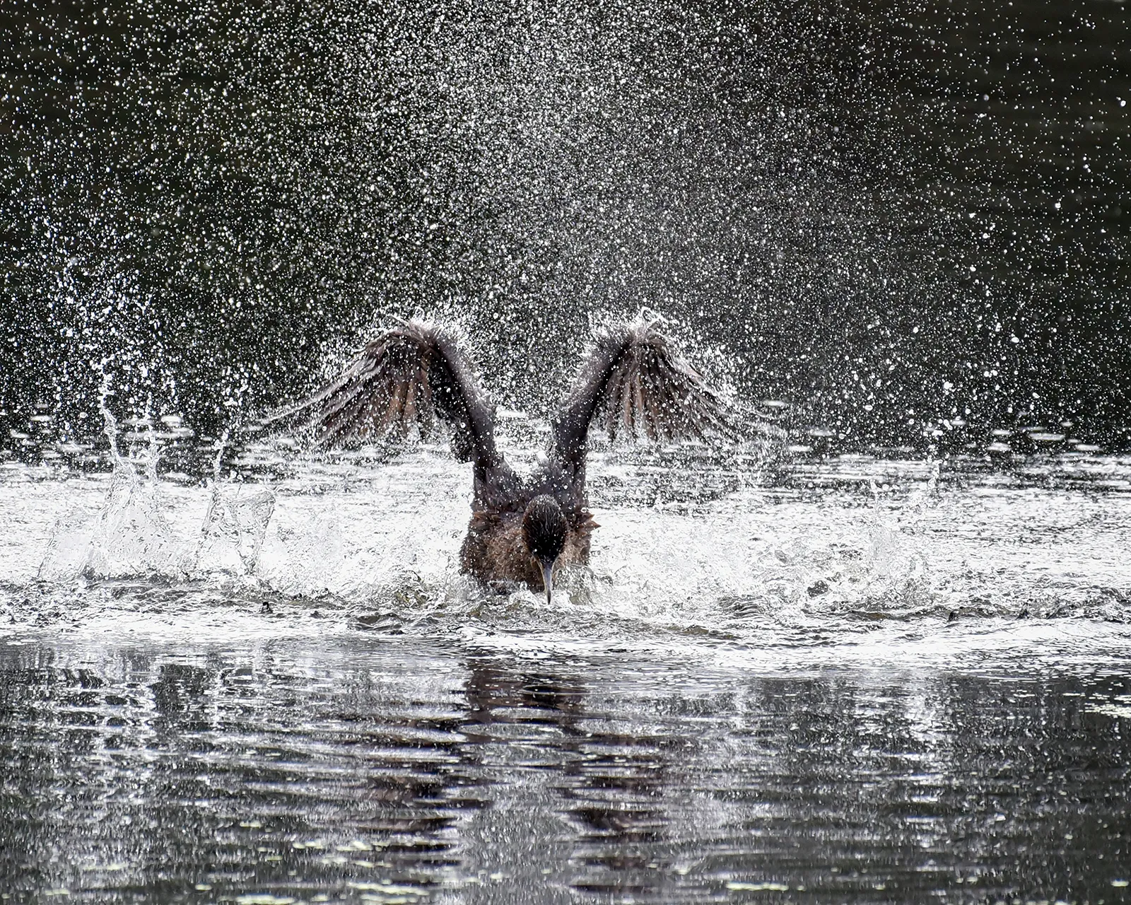 I was blessed to catch the cormorant performing this splashing behavior. It is part of a mating ritual that includes zigzagging through the water, diving and splashing wildly to attract a mate.