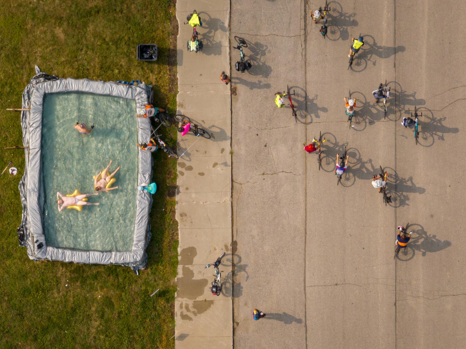 Clad in Stars and Stripes bikini bottoms, some cyclists relax in a pool as other cyclist on RAGBRAI head out of Knoxville and onto the day 5 meeting town of Albia on Thursday, July 25, 2024 in Marion County, Ia.