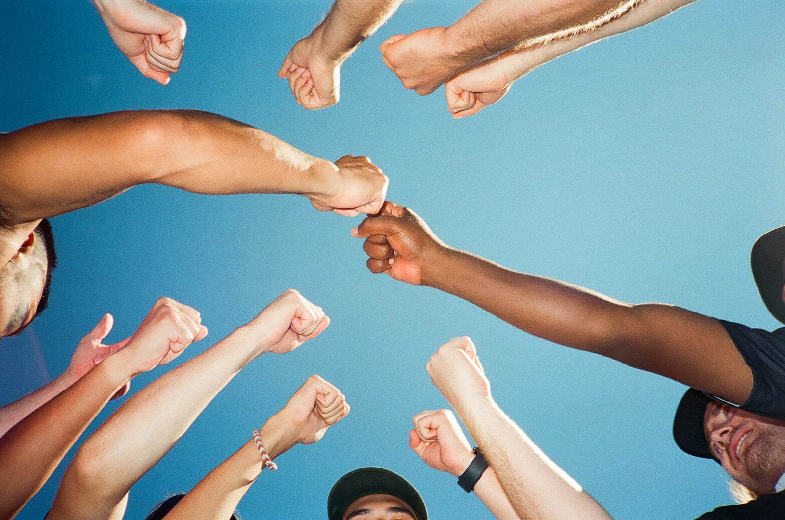 Shot on a 35mm point and shoot from below the team huddle of the men's club frisbee team M.O.B., the best mens team in Baltimore, before a tournament begins.