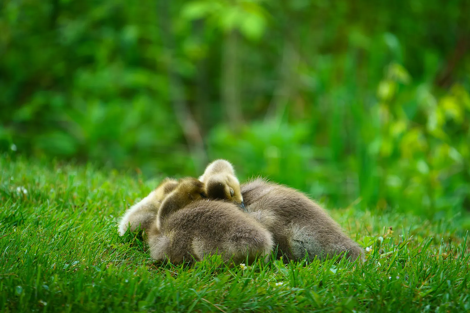 Sleeping baby Canada geese while the two adults are on the watch