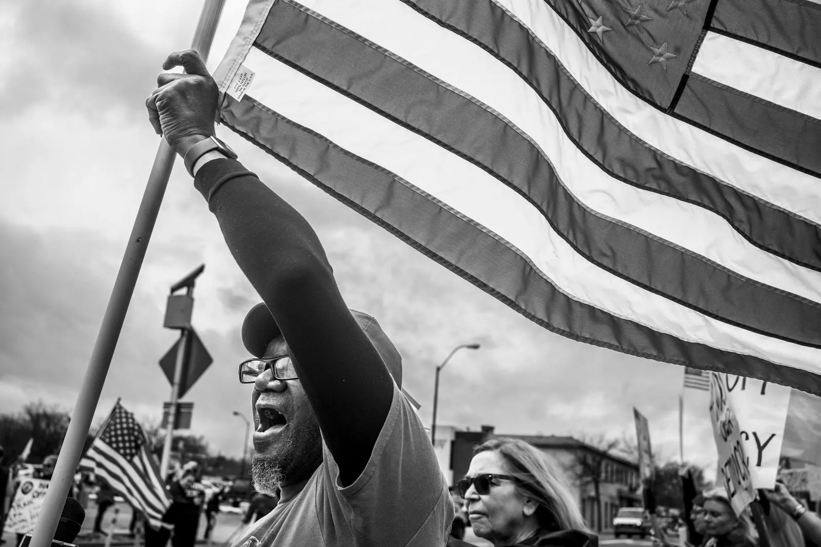 A Marine Veteran waves the American Flag during a protest in Akron, Ohio. The "Hands Off" protest was the largest one-day protest against the administration of Donald Trump with over 5 Million turing out all around the country.