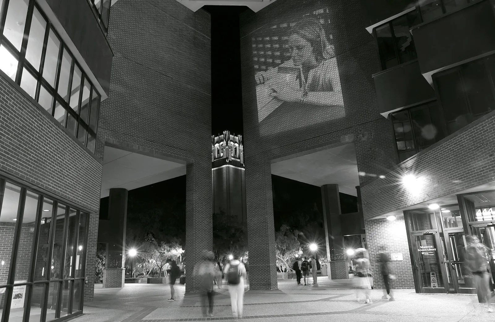 Students walk past Marston Science Library, while an archival image of a student searching through a card catalog drawer in the 1960s is projected on the building above. This project showcased archival photos from the University Digital Collections, projected onto iconic locations around the University of Florida campus.