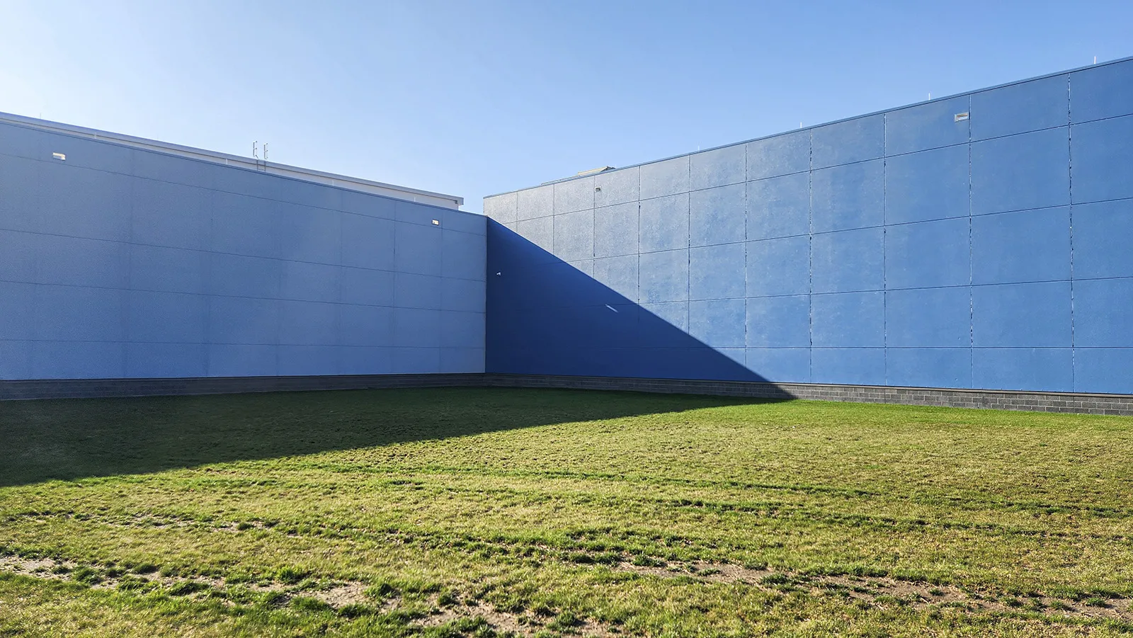 Morning shadows creep across the grass and walls of a sports facility in Sandusky, Ohio.