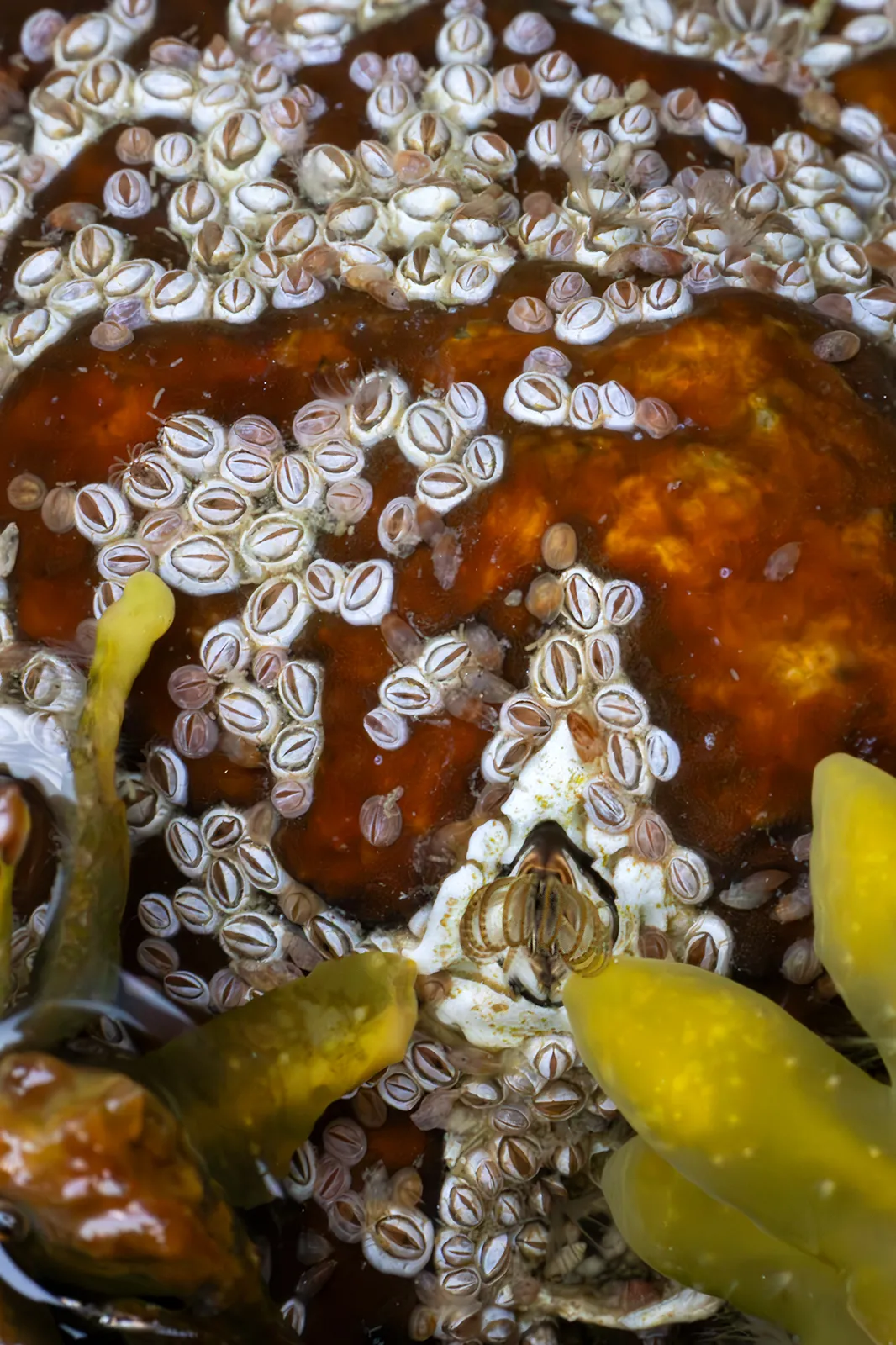 Baby barnacles less than 2 mm long appear as light dots on rocks and shells and even adult barnacles during early Spring in New England. Once they decide to cement permanently onto a surface, they secrete one of the strongest adhesives in the natural world and attach themselves face down. These creatures emit feathery appendages called cirri, basically feet to rake plankton and microscopic organisms into their shells for sustenance, while cleaning the waters around them. I first noticed these tiny barnacles in tide pools along the shoreline of the Long Island Sound and spent hours fascinated by these sesame seed-like creatures sifting through brightly-colored algae