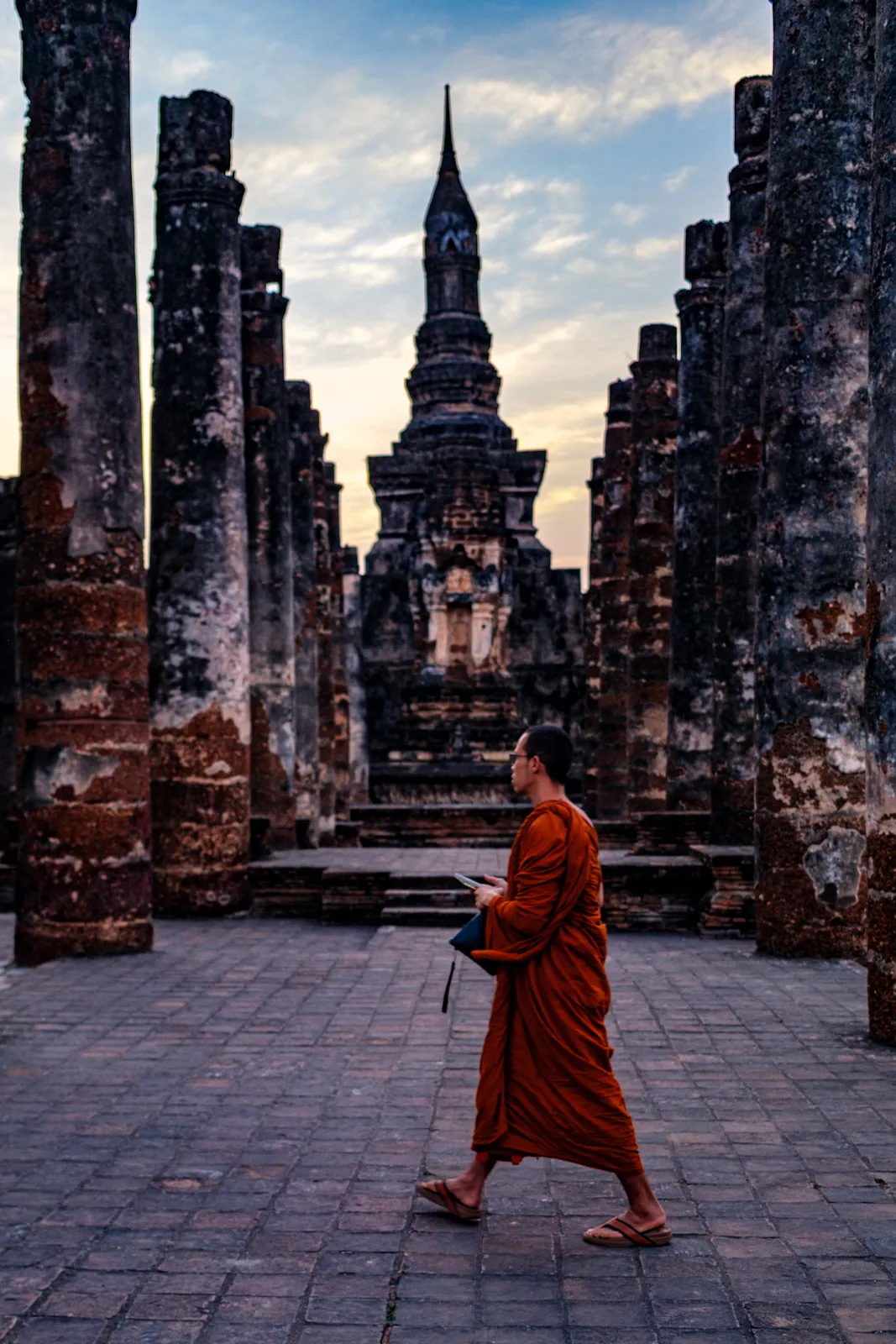 A monk walks amongst the ruins at the Sukhothai Historic Park which is a UNESCO world heritage site located in Sukhothai, Thailand.
