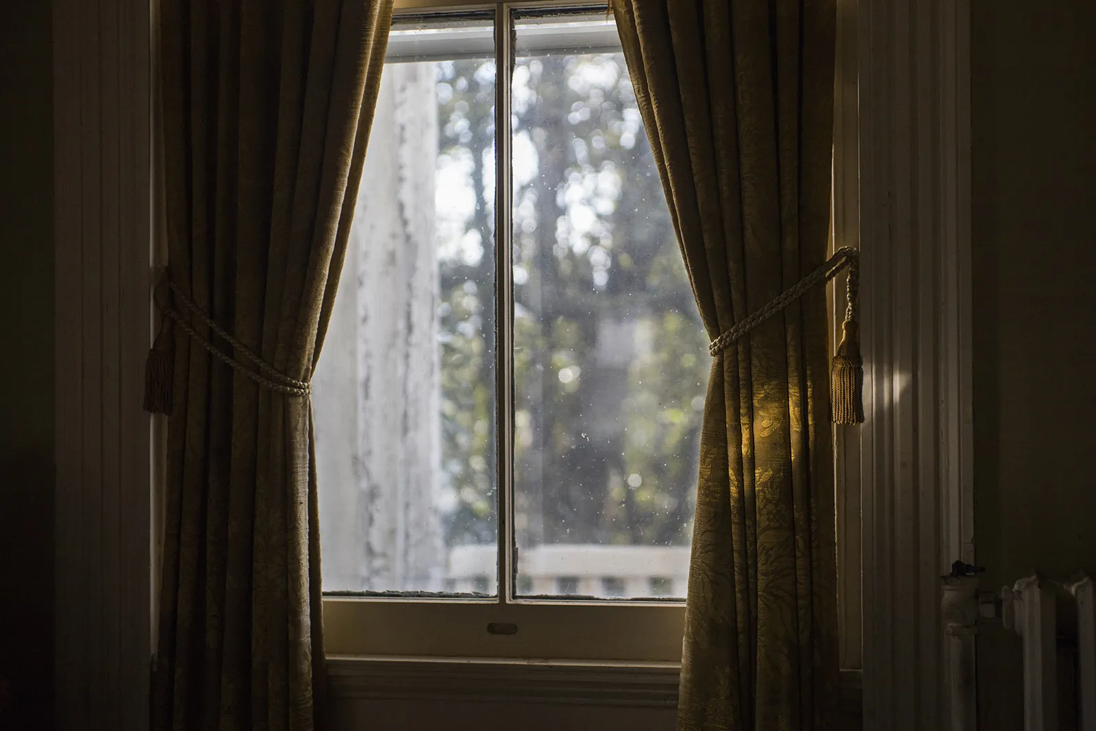 A sliver of morning sunlight highlights the drapes of a historic home that predates the Civil War in Macon, Georgia. The view now looks out onto a wraparound colonnade of peeling paint broken bannisters.