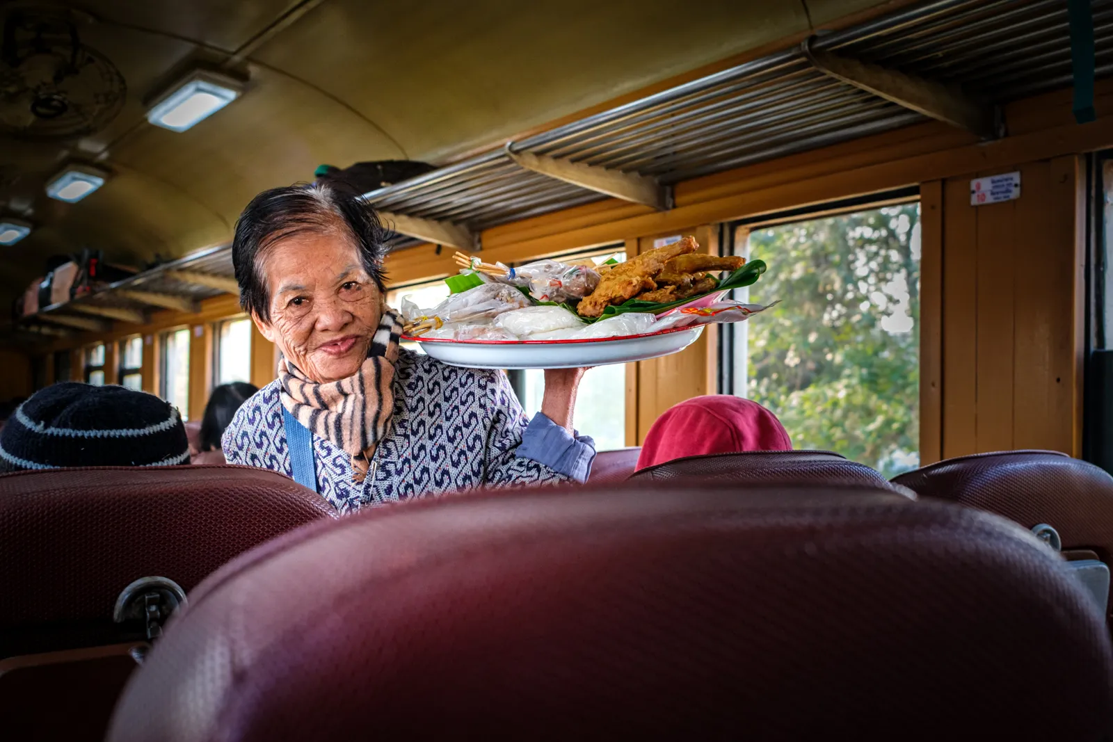 A Thai women hops aboard the train to serve fresh hot food for passengers traveling across Thailand.