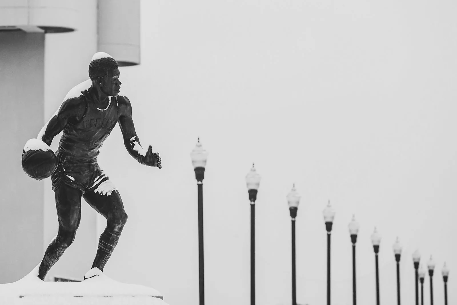 Bronze statue of Coolidge Ball, the University’s first Black student-athlete, on a snowy day on Friday January 10, 2025.