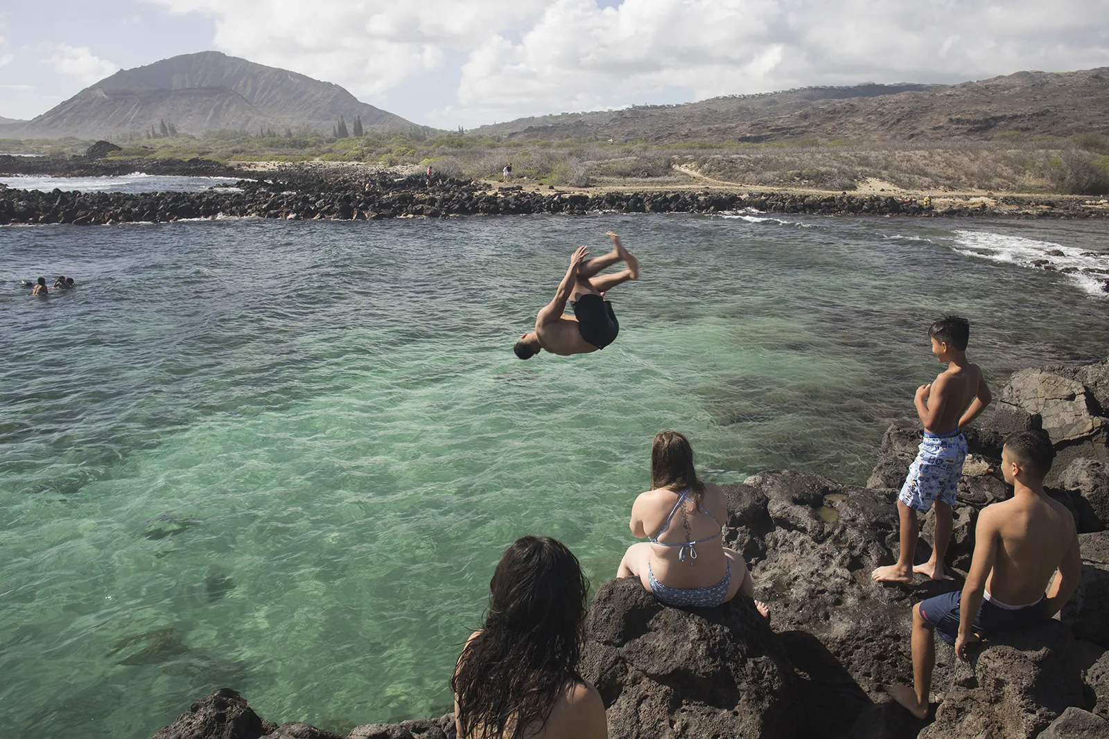 A local Hawaiian boy flips off a perch of lava rocks into a shallow lagoon as friends look on on the island of Oahu, Hawaii.