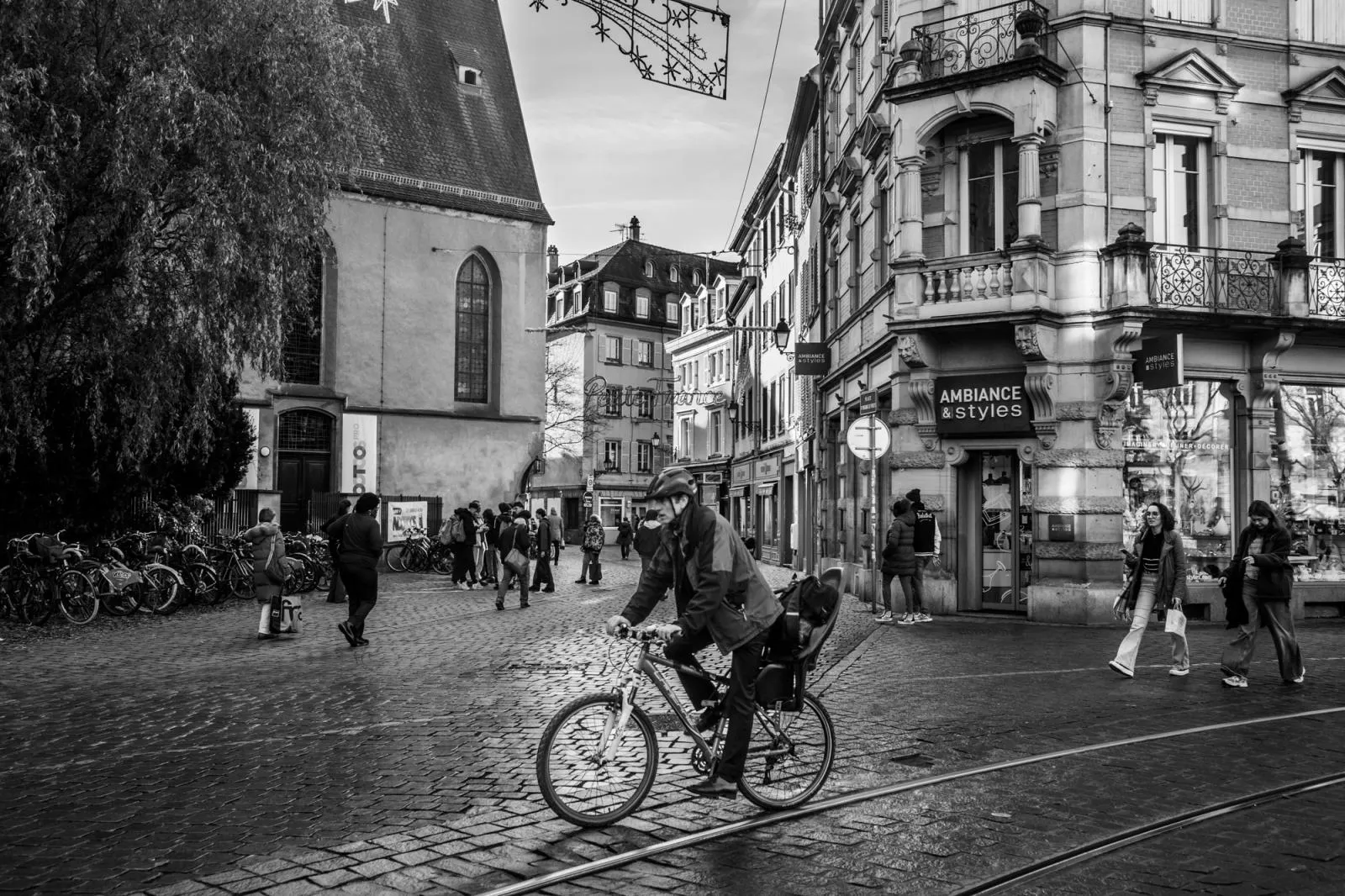 A man rides a bicycle through the streets of Strasbourg, France during the Christmas holiday festival.