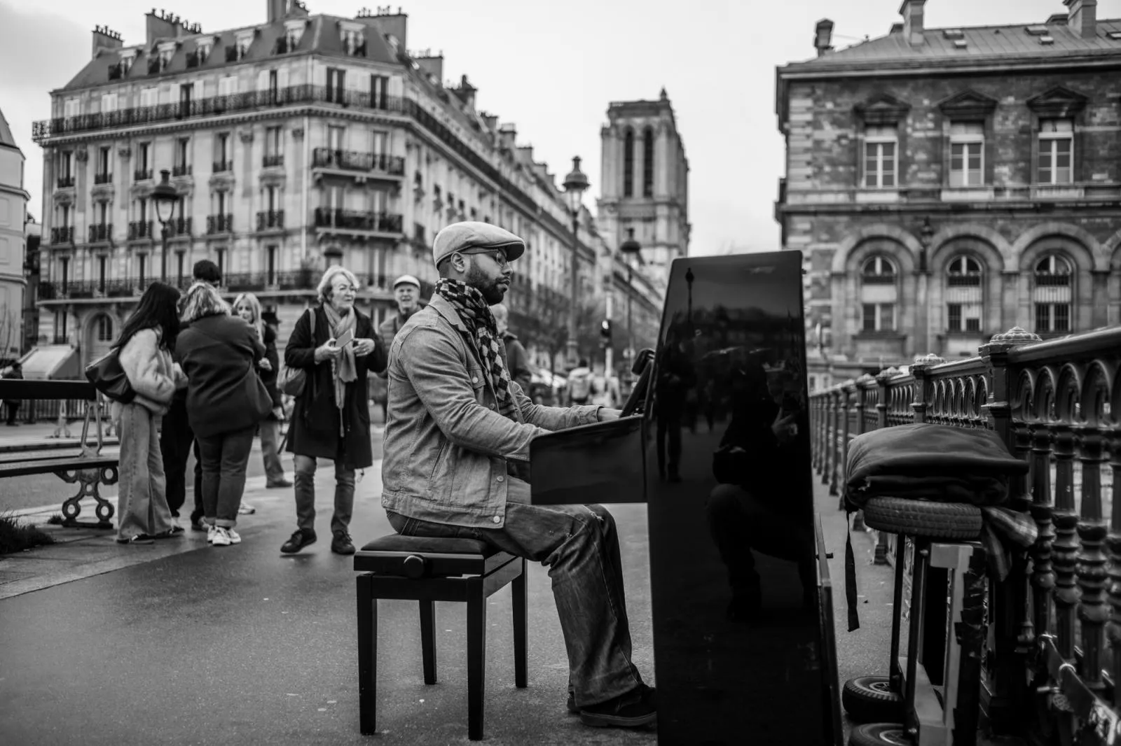 A street performer plays a piano on a bridge over the Seine River in Paris.