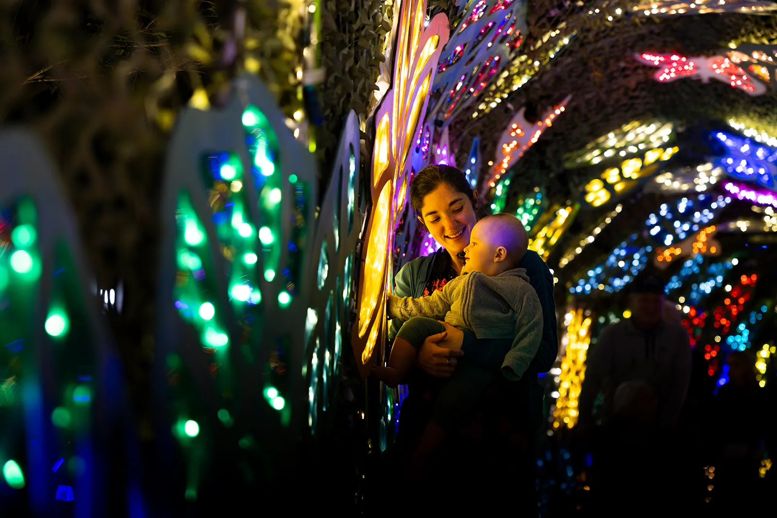 Karen holds Julian as they admire Christmas lights in the Marie Selby Botanical Gardens in Sarasota, Fla, Friday, Dec. 26, 2025.