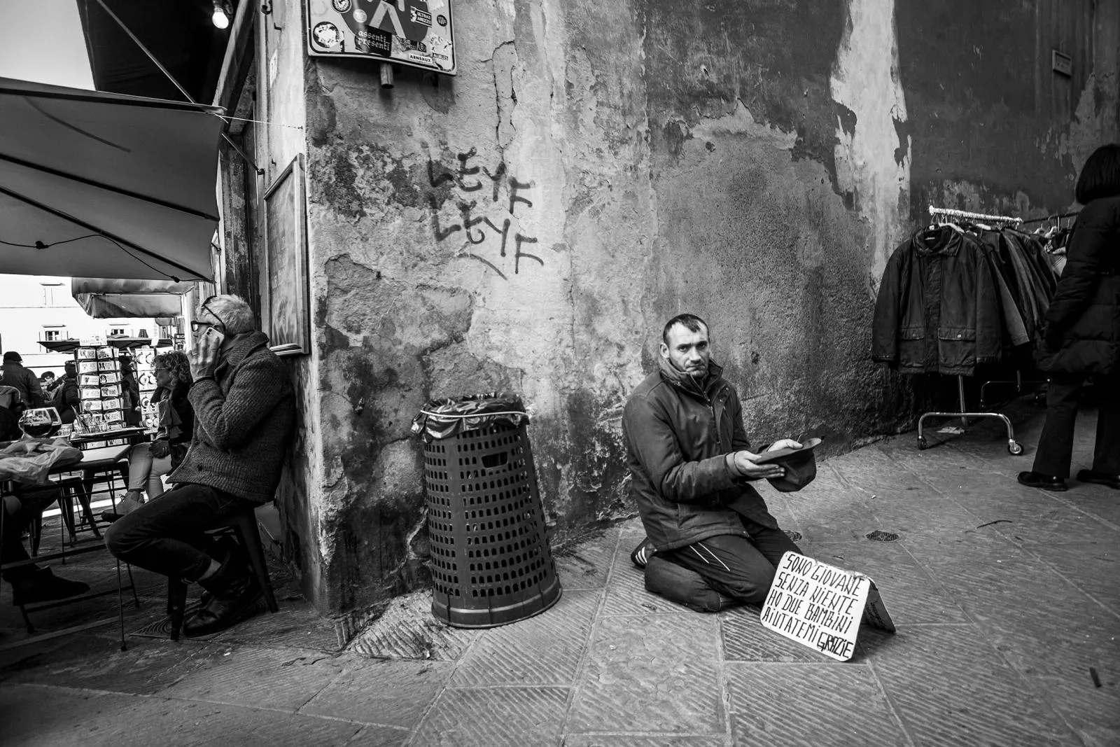 A beggar asks for money on the streets of Arezzo, Italy. His sign says he is young, has nothing and has children to feed.