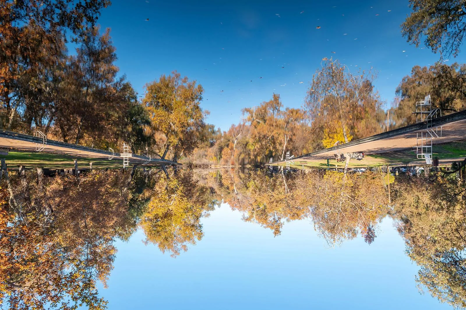 A view of fall colors reflected in Sycamore Pool on Wednesday, December 4, 2024 in Chico, Calif.