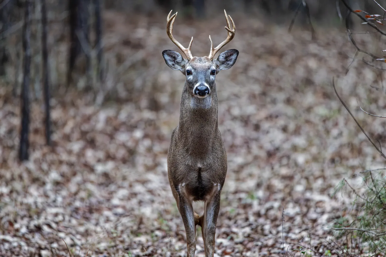 An eight-point Whitetail buck stands tall and alert after walking onto the path in the woods on Thursday, Dec. 26, 2024, in Blue Springs, Miss.