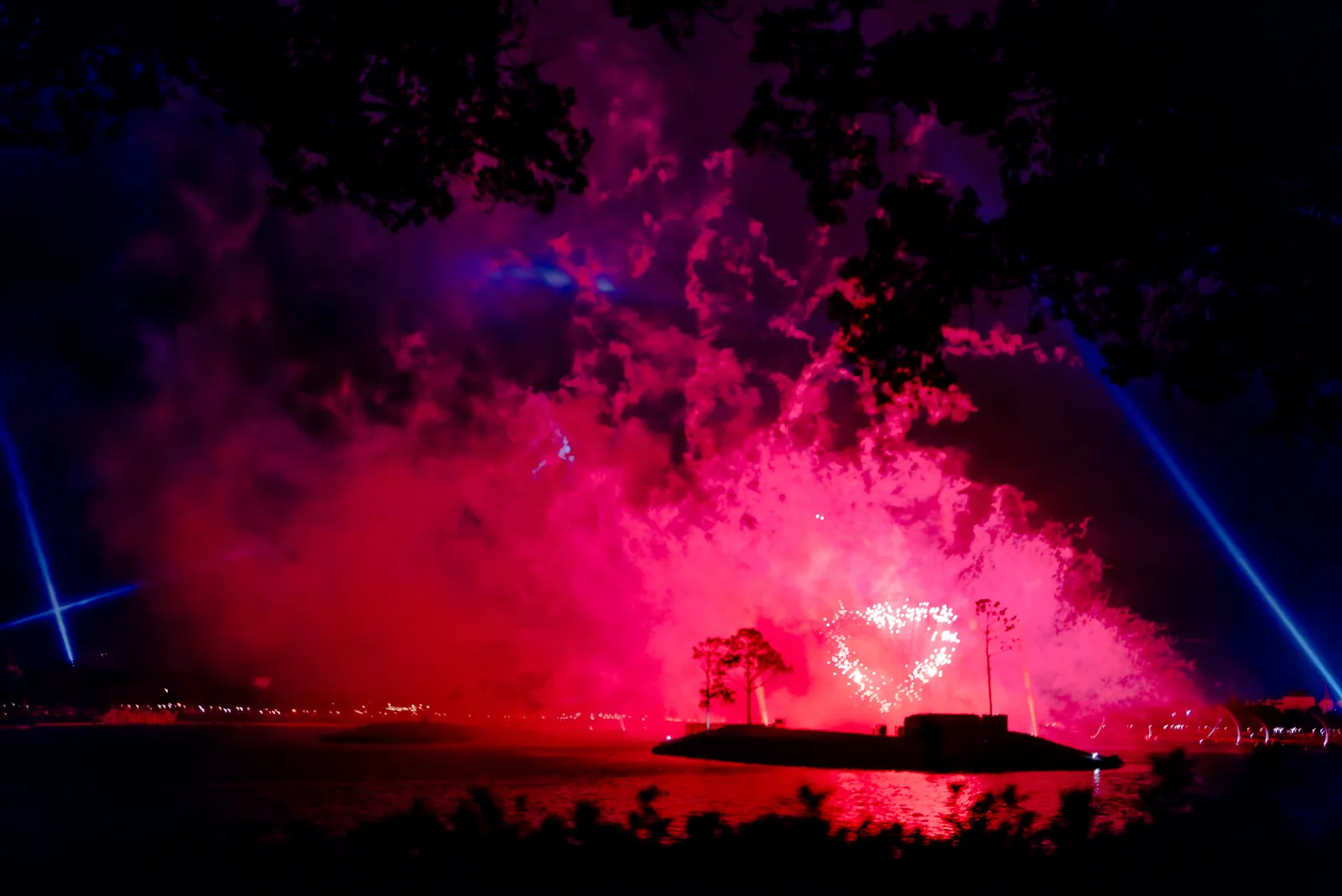 A heart shaped firework emerges from smoke and dust surround by shafts of light
