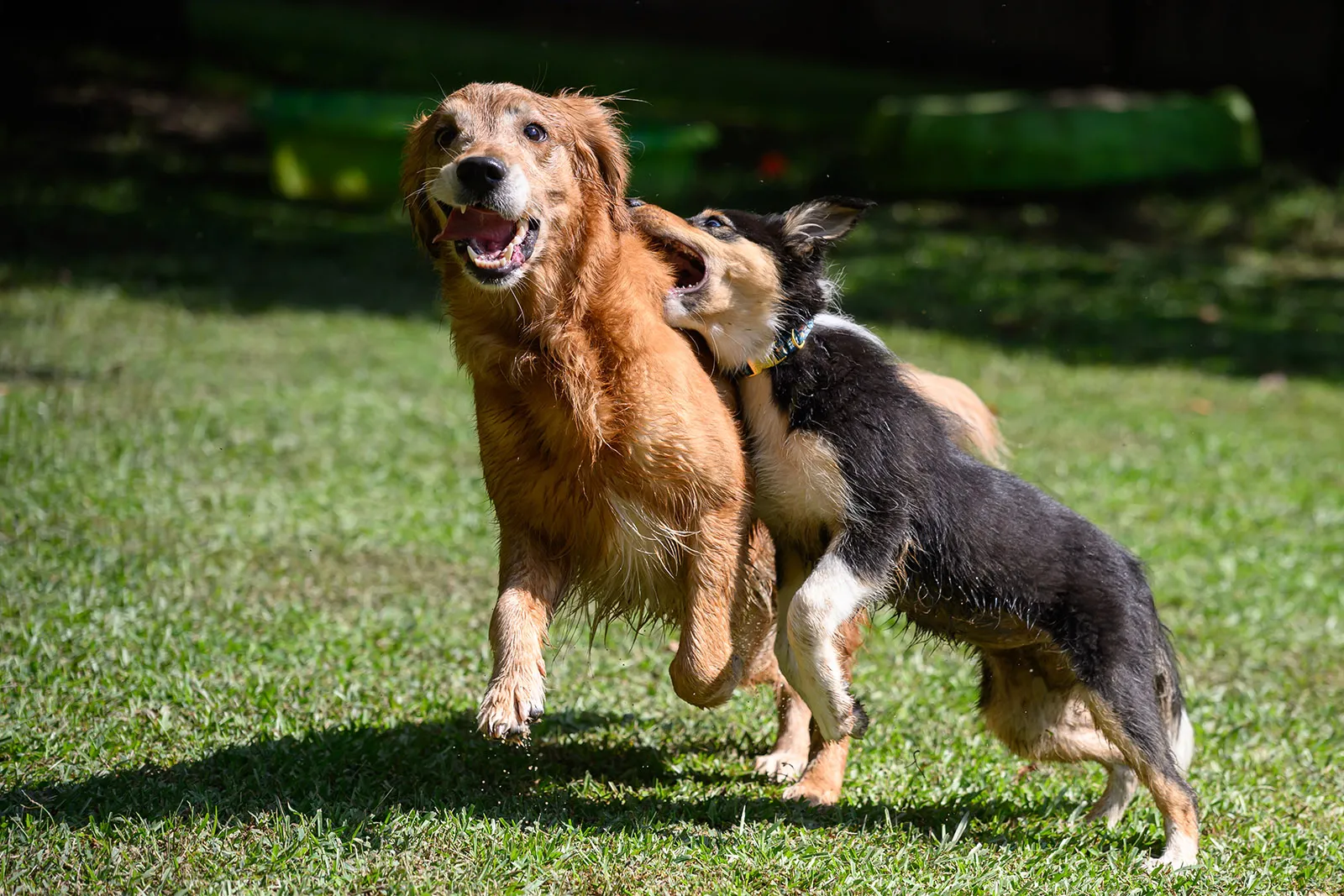 Five year old golden retriever Tali enjoys running around with her new, fourth month old sister June. June is a border collie... and the herding instincts show. Tali doesn't seem to mind as long as there's some mud puddles around to run through.
