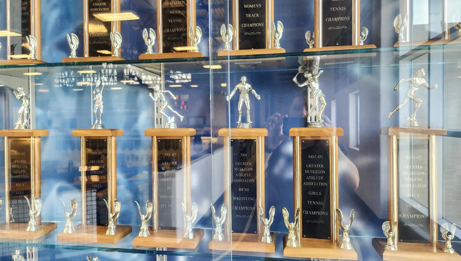 Close up view of a trophy case with reflections in sunlight at a high school in Michigan.