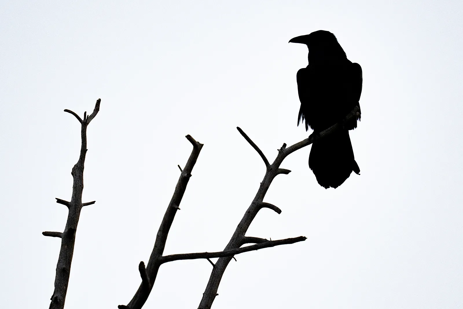 A raven is silhouetted on a tree while watching traffic pass by inside Grand Tetons National Park.