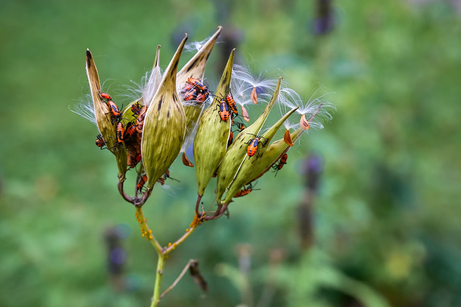 These busy orange and black milkweed bugs are abundant in fall. Though they feed off the milkweed plant in swarms, they do little harm to the plant and don't compete with monarchs. They're just interesting to watch.