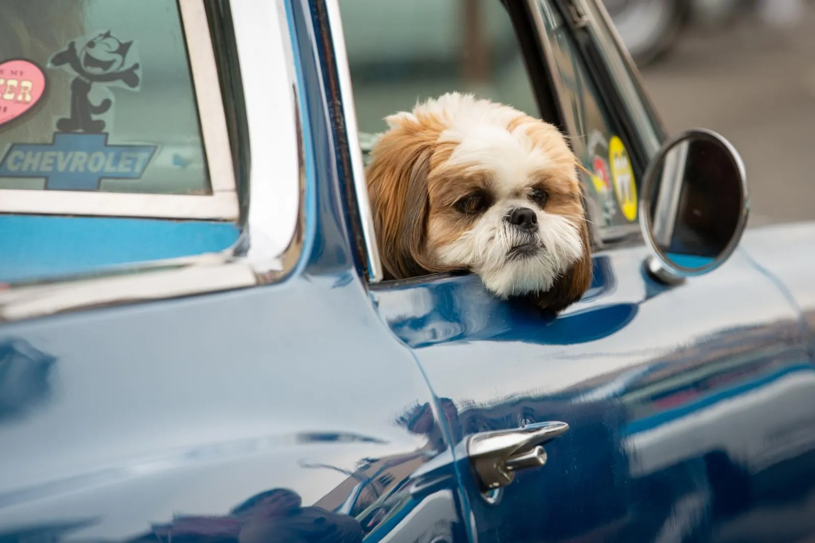 A dog appears out of the passenger side of a classic car as they cruise down Euclid Ave. during the Route 66 Cruisin’ Reunion on Saturday, September 21, 2024, in downtown Ontario.