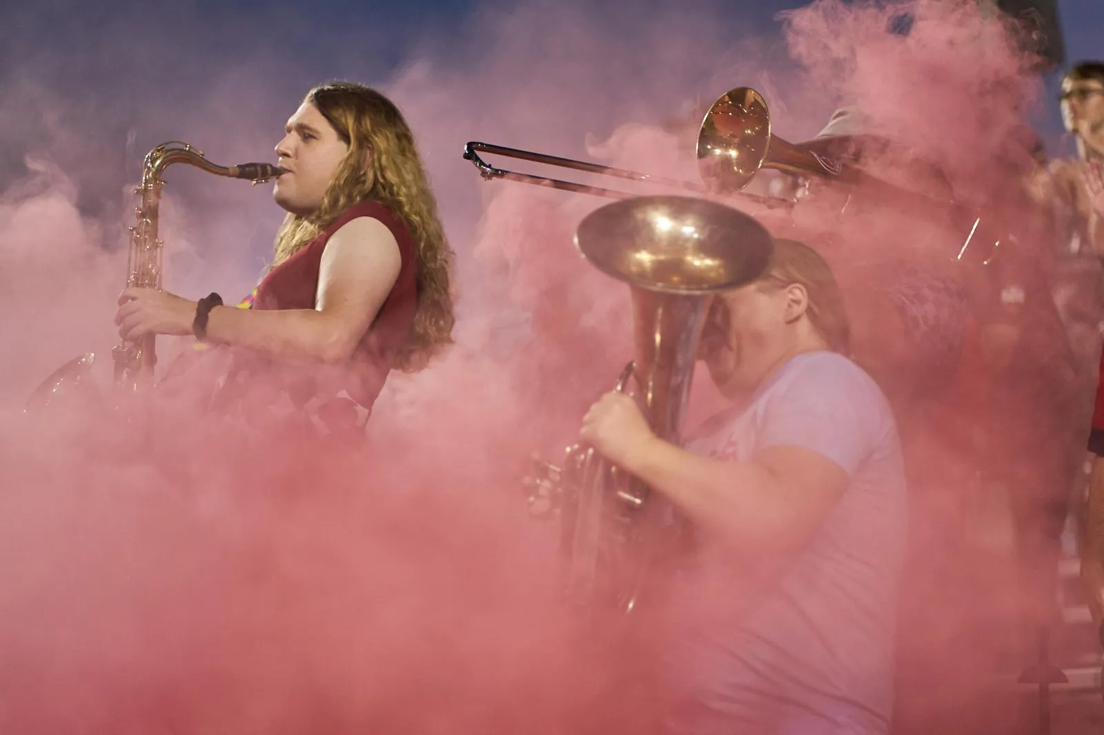 Musicians play amidst the rising smoke as Indy Eleven fans celebrate a goal.