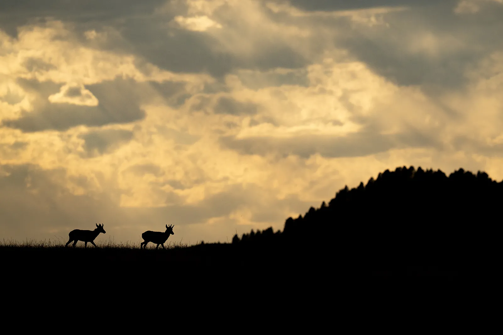 Two Pronghorn's are silhouetted on a ridge alongside a stretch of highway in the middle of Wyoming.
