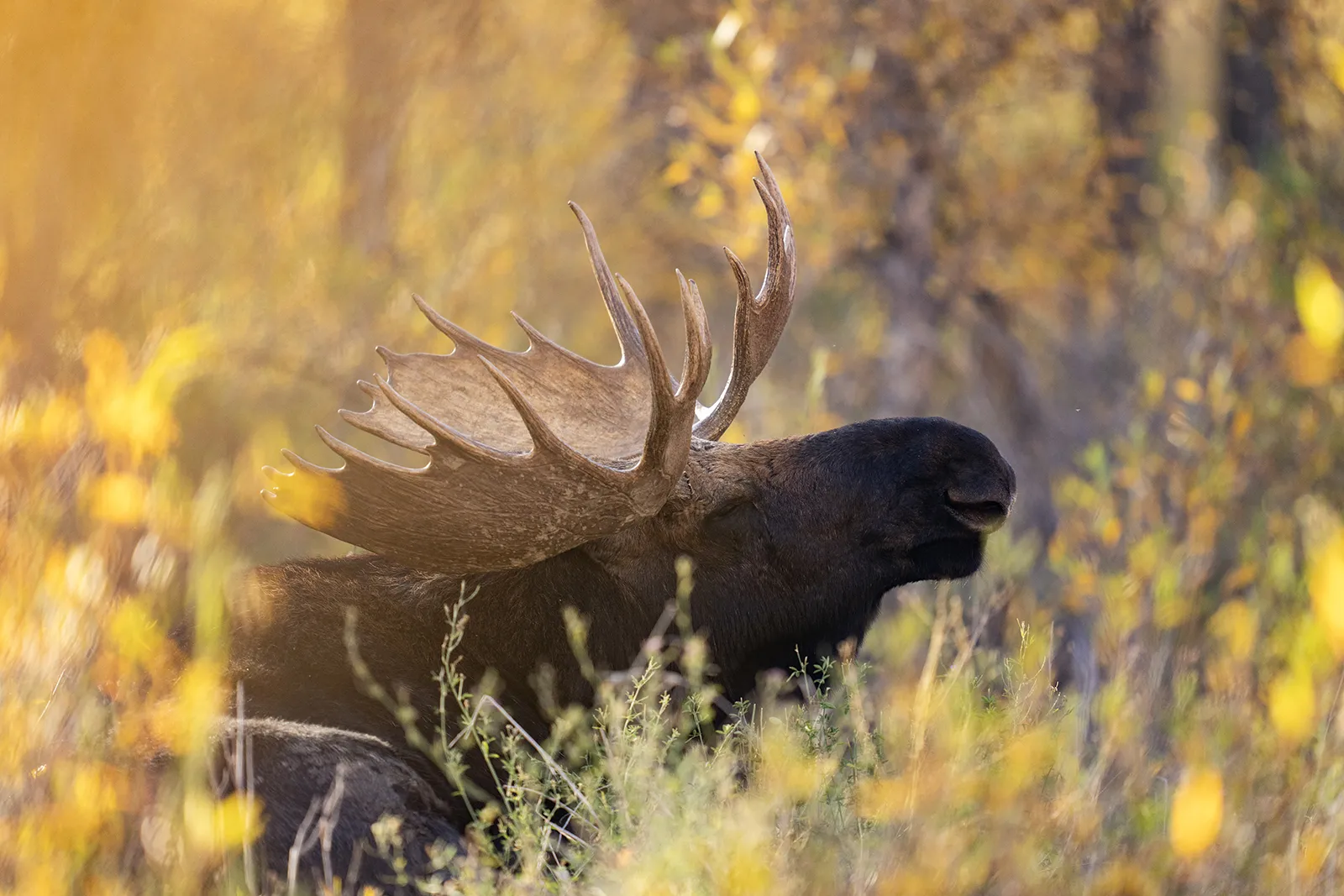 A bull moose calls out to a nearby cow and calf as he sits beside a river in early morning light inside the Grand Tetons National Park.