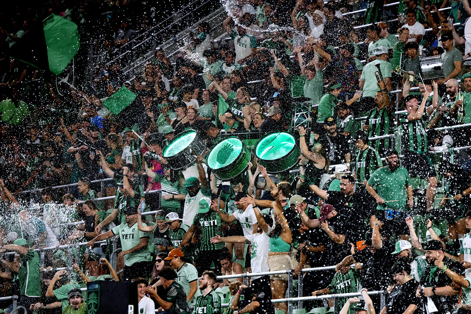 The Austin FC supporter section throws water during the first half of the match against Real Salt Lake at Q2 Stadium in Austin, Texas, on Saturday, Sept. 28, 2024.