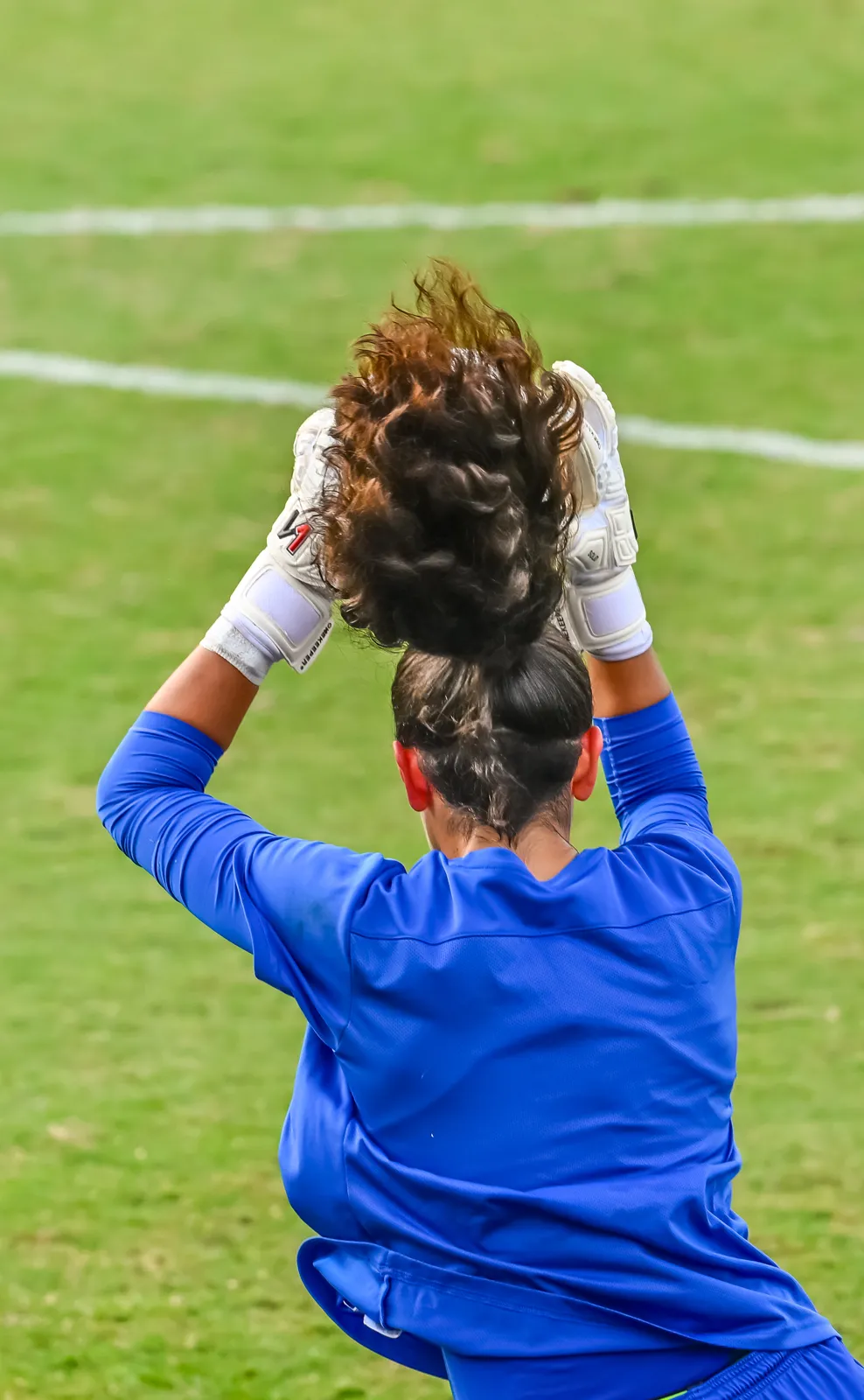 University of Florida soccer goalie's ponytail covers up the soccer ball as she makes a save during the UF vs Arkansas game on September 11, 2025