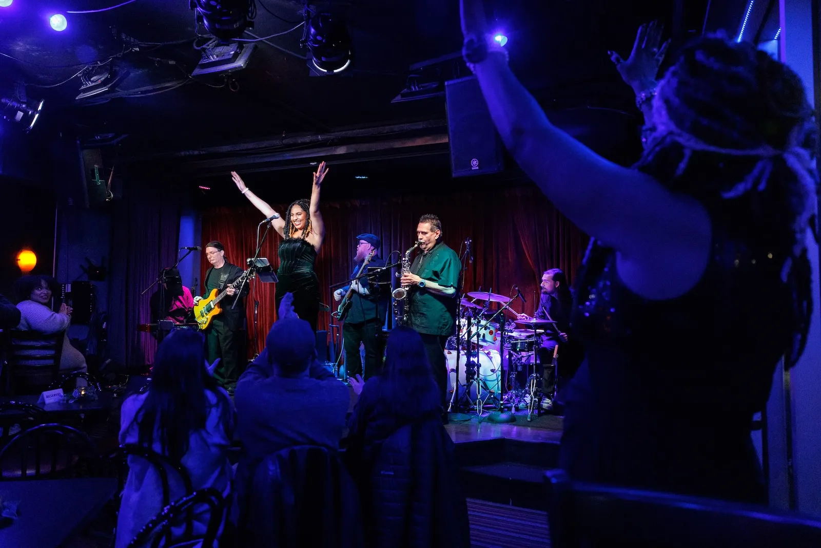 Monica Evans, right foreground, and her daughter, singer Elana Purvis, are mirror images after Purvis debuts an original composition during her appearance at Blues Boulevard Jazz Club in Greenville, SC.