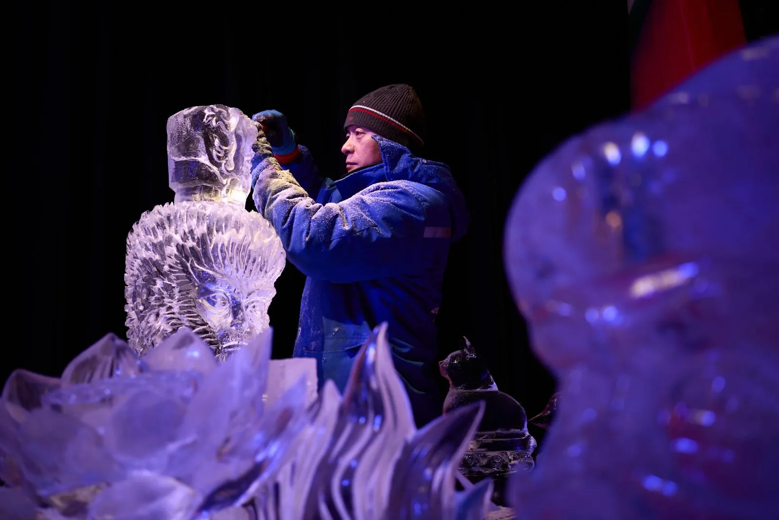 A sculptor works on an ice carving at a show at the Opryland Convention Center.
