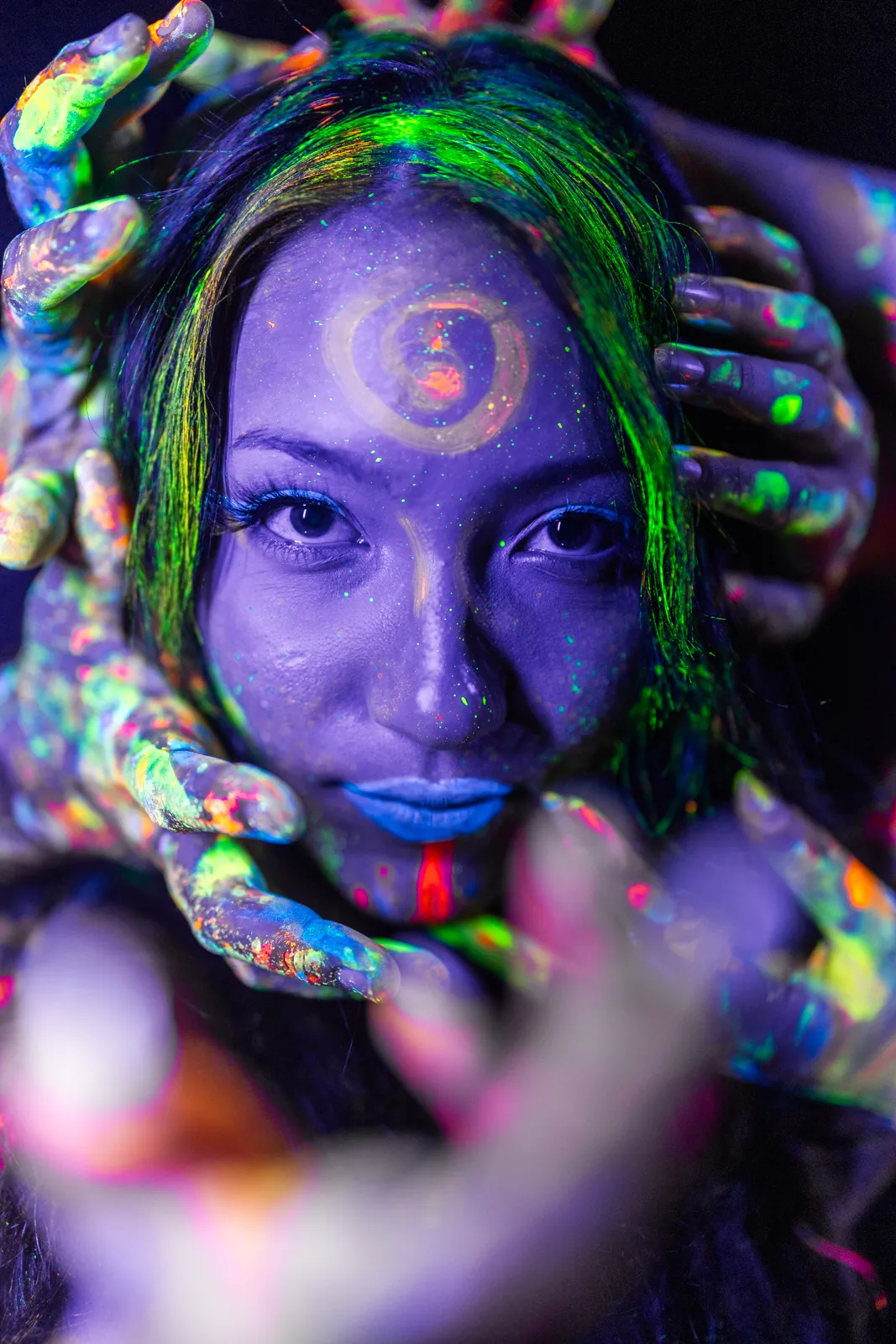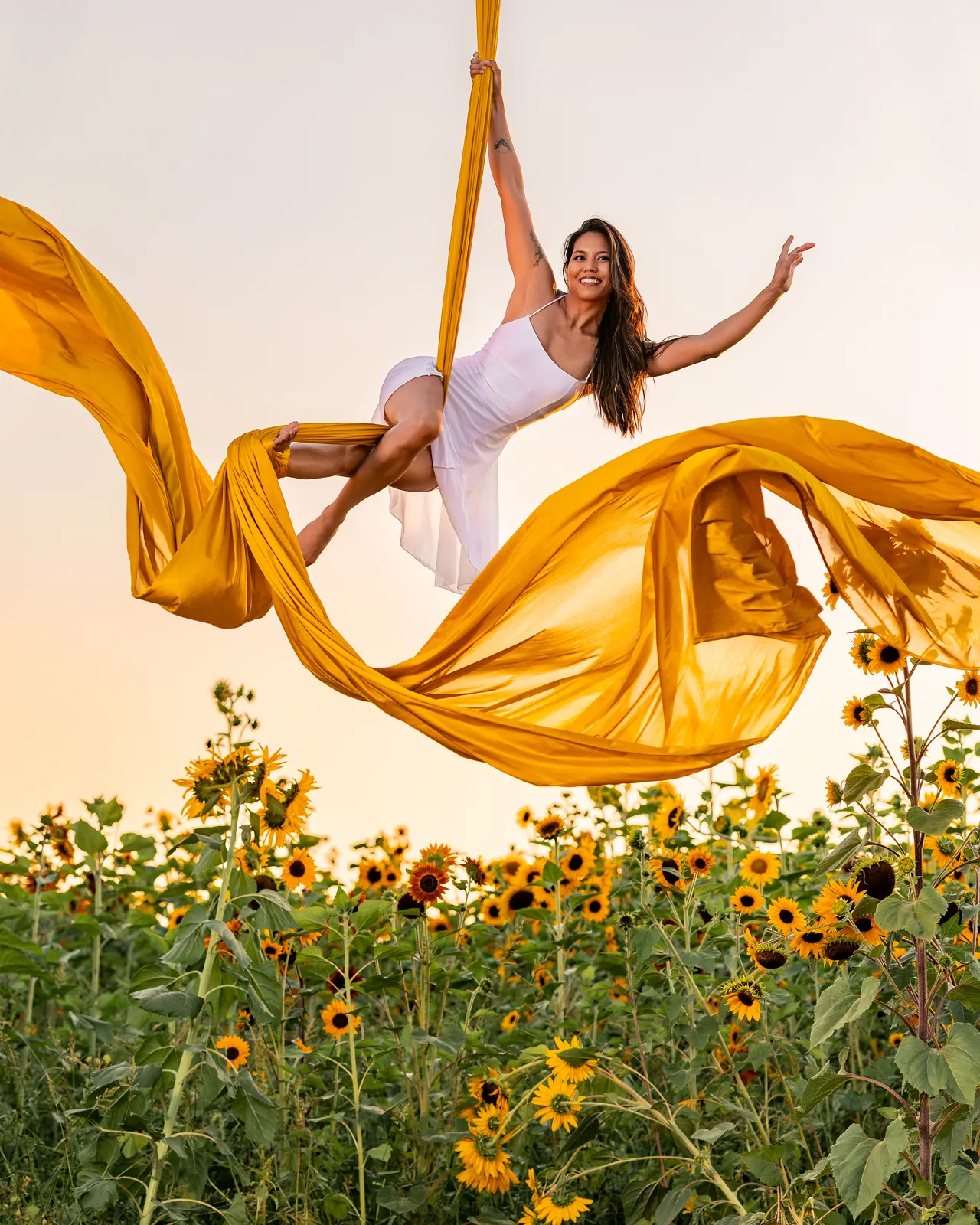 Aerialist soars above a sunflower field on the apparatus aerial silks.