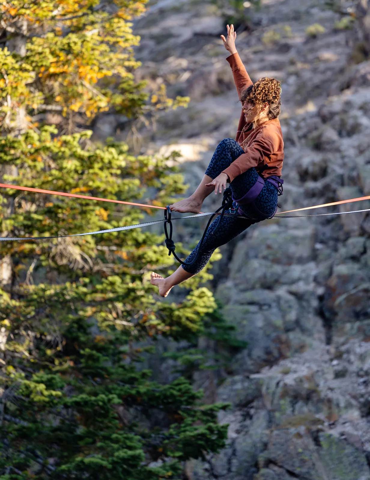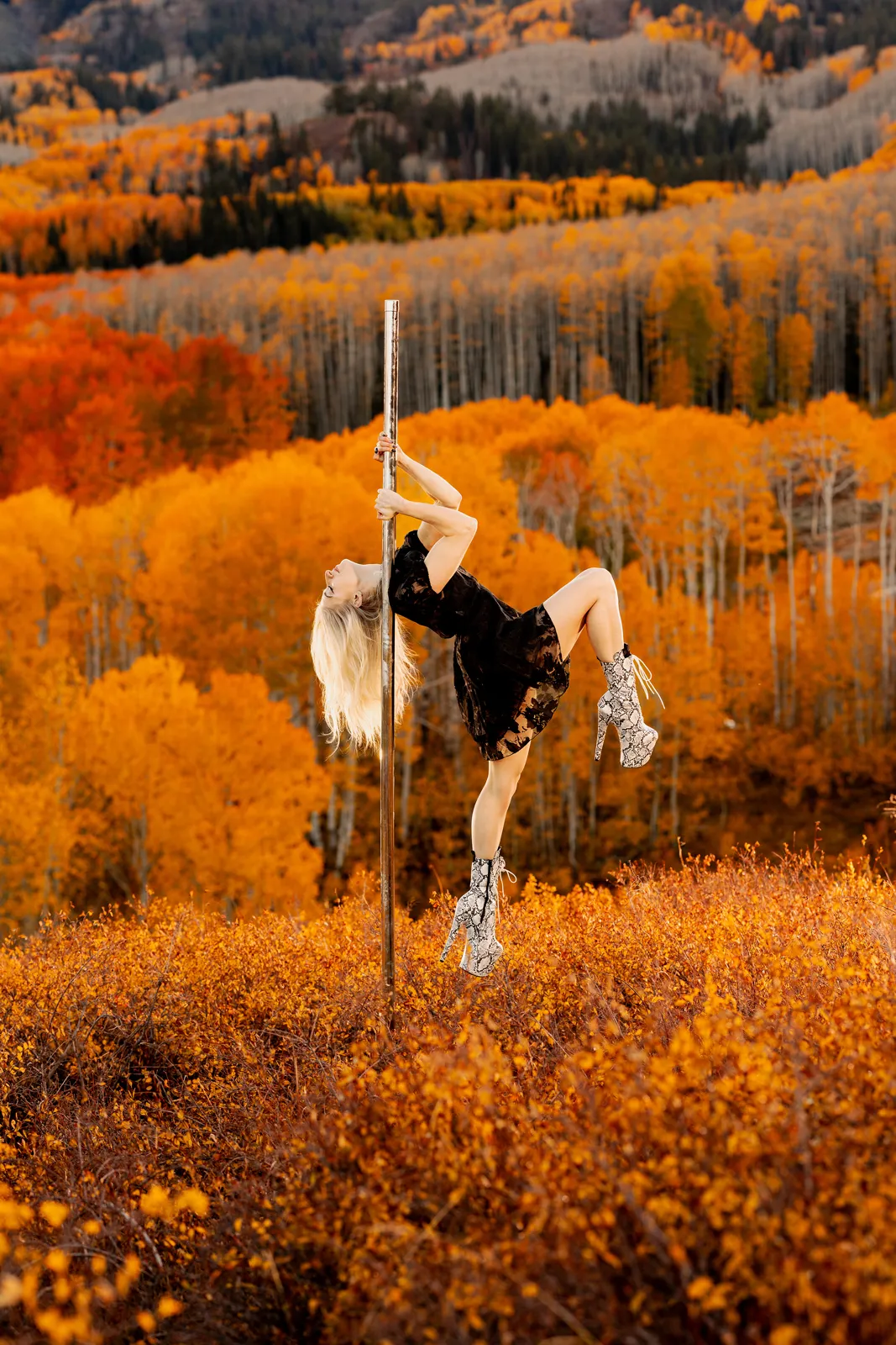 Pole athlete demonstrates a modified shoulder mount surrounded by an ever changing canyon scene.