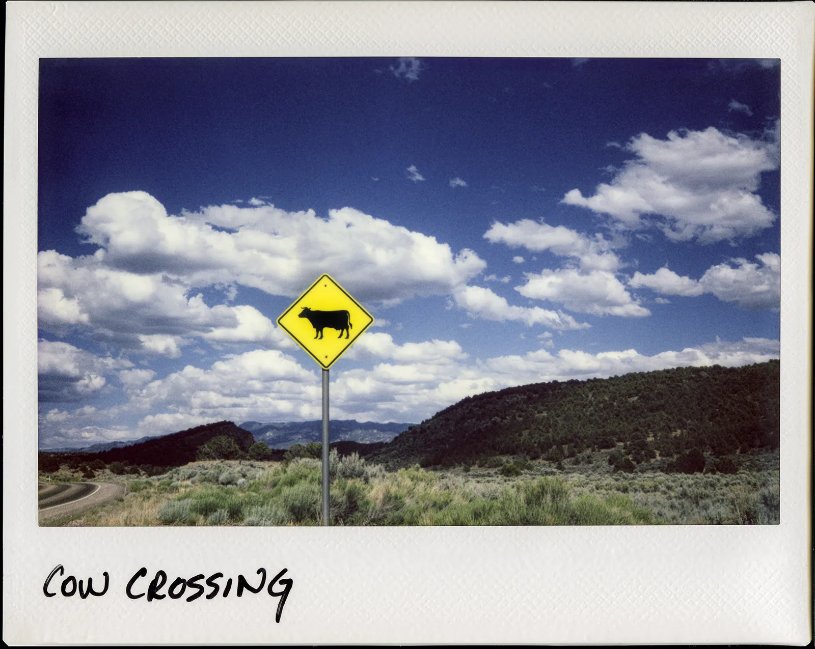 A sign is seen along the side of the road in Utah. Photo taken using a Fujifilm Instax Wide instant film camera, hand written and flat bed scanned.