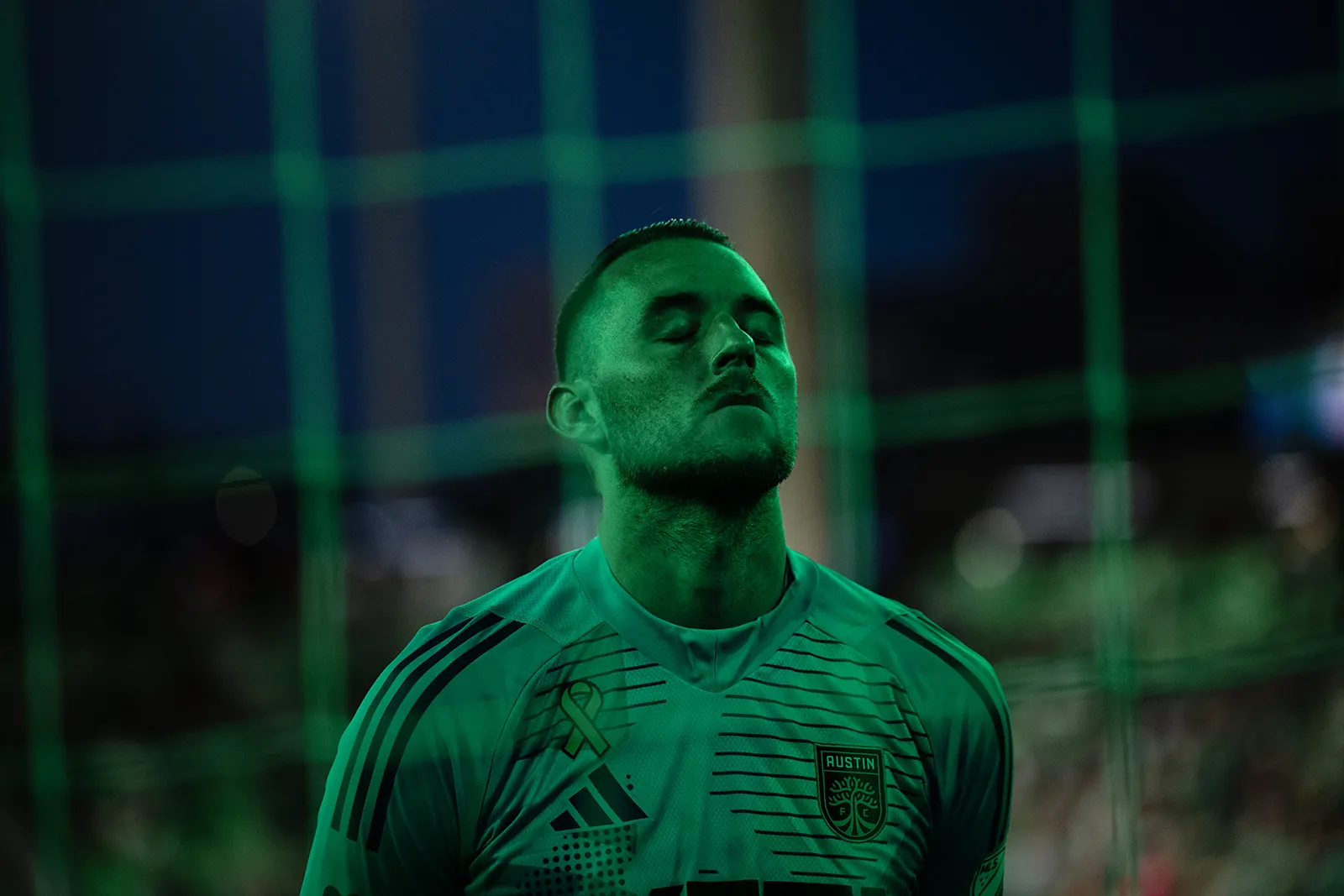 Austin FC goalkeeper Brad Stuver #1 takes a moment at the goal before the match against Real Salt Lake at Q2 Stadium in Austin, Texas, on Saturday, Sept. 28, 2024.