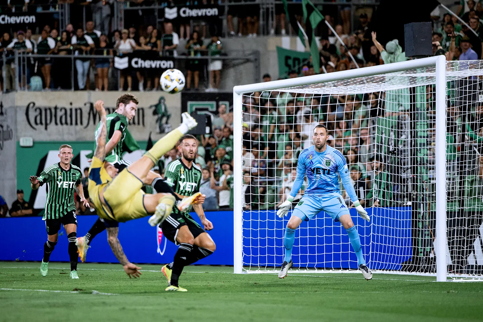 Austin FC goalkeeper Brad Stuver #1 defends the goal as a Real Salt Lake player attempts a shot during the first half of the match against Real Salt Lake at Q2 Stadium in Austin, Texas, on Saturday, Sept. 28, 2024.